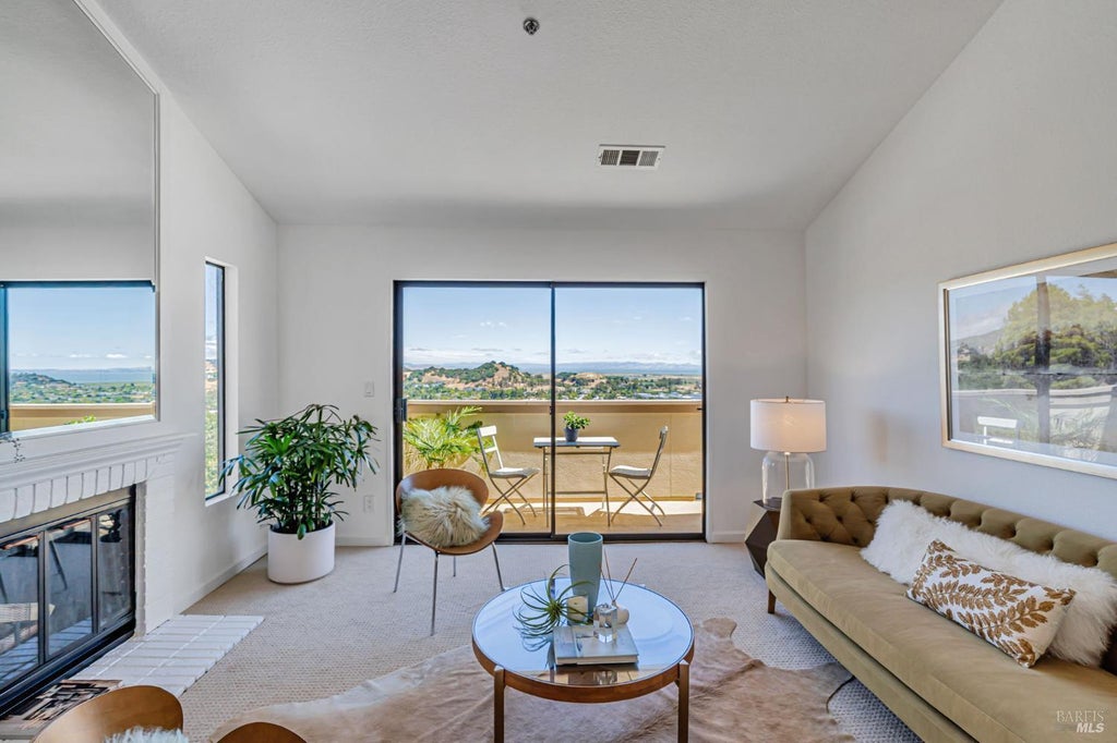 Beautifully updated top floor end unit with vast views of San Pablo Bay and the hills. Gorgeous open concept living room with high vaulted ceilings and a fireplace. Stunning stainless steel gas kitchen with quartz countertops. Spacious bedroom with an enormous walk in closet. One car deeded garage with a storage closet. Common area exercise room with a bathroom, dry-sauna and a furnished deck for your outdoor enjoyment. Great for commuters as it's near HWY 101.