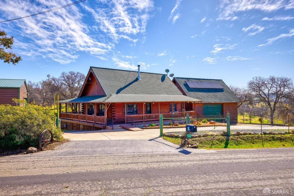 A lovely 1772sf+/-log cabin retreat, built circa 1992, boasts many amazing features. D-Log construction, French doors & plethora of Anderson windows. It's as beautiful inside as it is outside. Only a few minutes away from Lake Don Pedro and Lake McClure. A real dream come true, for that outdoor enthusiast! Pull up to the circular driveway & take in the beautiful curb appeal. With its expansive parking, inviting wrap-around porch & beautiful native surroundings, it's guaranteed to please! Enter the 1337sf+/- of living space, with its vast vaulted ceilings & beautiful exposed log beams, consisting of a cozy living room, kitchen and dining room combo, bath in hallway, leading to main bedroom with own private full bath. Then saunter up the stairs to 2nd bedroom/loft with own full bath. Through the loft/bedroom door & over the breezeway, you'll step into the 435sf+/- air conditioned, separate bonus suite with its ample space & far-reaching uses. Buyer to verify sf. As if that wasn't enough, the home is powered by Tesla solar, contained within 1 of the 3 attached garages of which can accommodate up to 5 vehicles, with an immense amount of storage space. Finally, look at the massive separate 30ft X 65ft metal shop, with three 14ft roll up doors, suitable for RV and/or boat storage.
