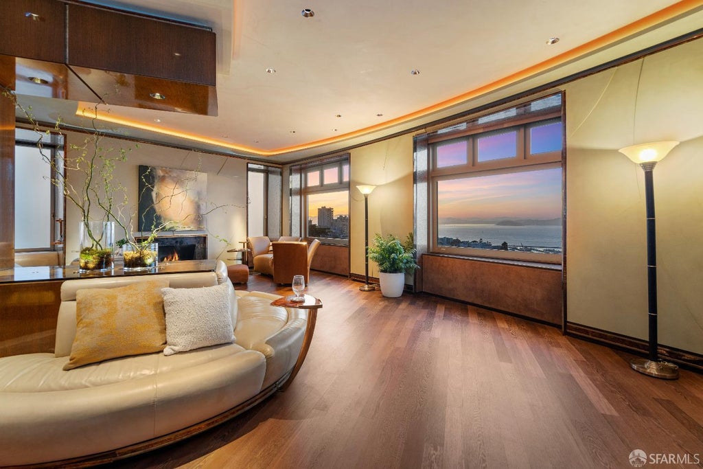 Located on an exclusive Russian Hill cul-de-sac and enveloped by sweeping views of the Bay and Downtown skyline, this extraordinary and European-Deco inspired, full-floor apartment is a work of art. Reminiscent of a finely crafted yacht, the interiors are wrapped in polished teak and bronze casework, mica-paneled walls, and softly curved surfaces all enhanced by custom lighting designed to accentuate the architecture and panoramic outlooks. The dramatic arc-shaped entry gallery opens to a series of well-designed entertaining spaces, featuring floors of wenge, banquettes, bespoke furnishings, and globally sourced materials of leather, silk, and hand-selected fabrics. In the northernmost rooms, oversized windows of the spectacular living & dining areas frame the Bay. A well outfitted kitchen is sun-lit, and an elegant powder bath is nearby. The large primary suite offers skyline views, custom furnishings, and a meticulously designed bath. An adjacent study offers flexibility as a second bedroom, lounge, or private home office. From its sought-after location and custom interiors to its seamless blend of luxury and design, #6 at 947 Green represents a rare opportunity to own one of San Francisco's most unique apartments.