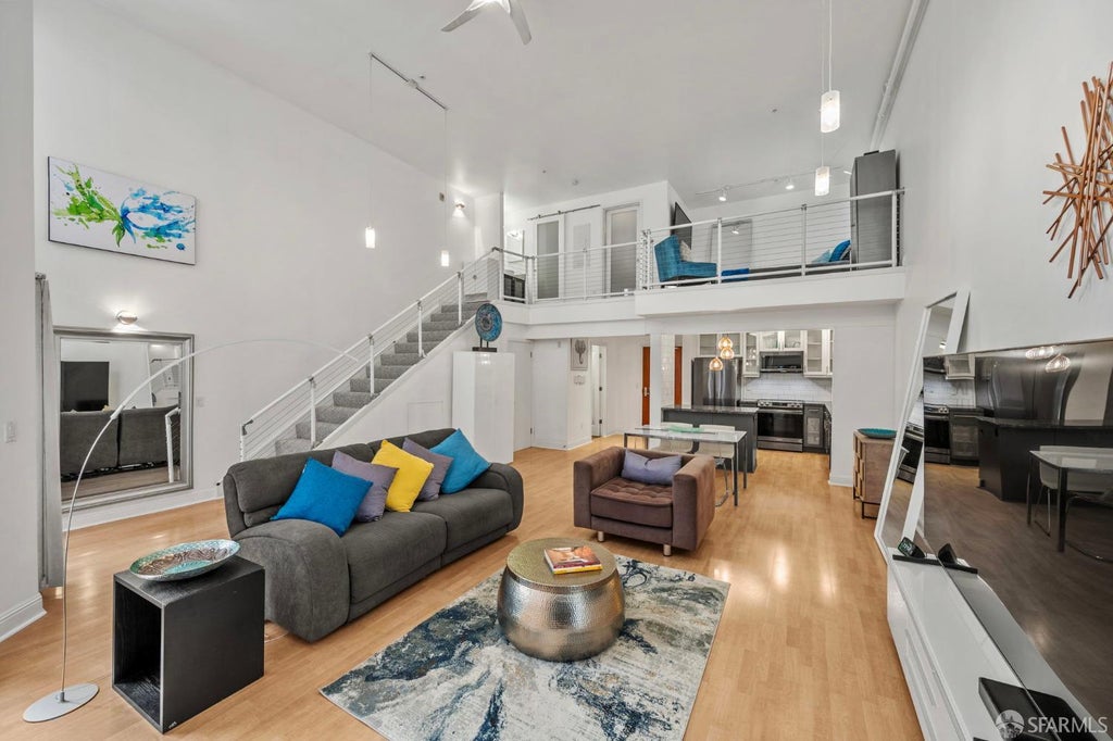 Discover turnkey SoMa loft living in this tastefully remodeled 1BD/2BA condo offering exceptional space, a terrace and parking just one block from Mission Bay amenities. Inside, double-height ceilings soar above with designer lighting and rows of oversized windows. Relax and entertain in the sprawling great room featuring a gas fireplace and an adjacent terrace. Chefs will adore the beautifully updated open kitchen, where glass cabinetry, granite counters and subway tile backsplashes surround a fleet of Samsung black stainless steel appliances. An oversized utility room with a stacked washer-dryer and generous storage completes the main floor. Head upstairs to explore the carpeted owner's suite loft, featuring a king-size sleeping area, an oversized walk-in closet, and an en suite bathroom with an open vanity and separate water closet/wet room rain shower. A deeded parking space with storage and EV-ready wiring completes this move-in ready SoMa showplace. Contemporary building with Butterfly MX intercom entry. One block from all Mission Bay amenities, waterfront outdoor space, Oracle and Chase stadiums, UCSF, shopping, freeways and transportation. Including Caltrain, and new T-Line to Chinatown, North Beach and MB.