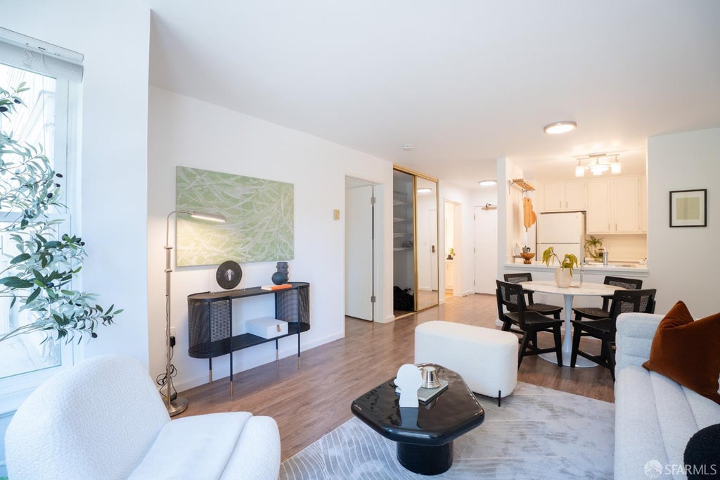 Discover your urban oasis in this beautifully renovated one-bedroom condo at prestigious Potrero Court. Bathed in coveted western light, this bright and airy home welcomes you with rich engineered wood floors that flow seamlessly throughout the thoughtfully designed open floor plan. The space effortlessly transitions from a well-appointed kitchen to a dedicated dining area and into the generous living space, culminating with your own private sunny balcony - perfect for morning coffee. The spacious primary bedroom easily accommodates a queen-sized bed and offers a walk-through closet. This versatile space can be completely customized to suit your lifestyle, whether you envision built-in organizers, a vanity area, or additional workspace. The bathroom features a new vanity, while the updated kitchen boasts contemporary appliances and ample counter space for both everyday living and entertaining. Enjoy resort-style amenities at an incredibly affordable price point: a state-of-the-art fitness center, sparkling swimming pool and relaxing hot tub, clubhouse perfect for hosting gatherings, outdoor BBQ area for al fresco dining, and your own dedicated parking space. Close to Potrero Hill, Inner Mission, and Dogpatch. You're just minutes from MUNI lines, major freeways.