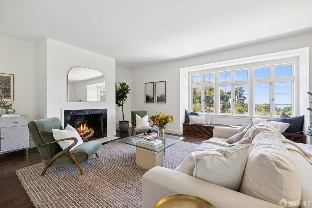 A rare offering on the Presidio Wall, this distinguished home enjoys a premier location directly across from the iconic Presidio Wall Playground and miles of scenic Presidio trails. With rich architectural character and enduring charm, the home is designed for both comfort and grandeur. The gracious living room features high ceilings, gleaming hardwood floors, and a cozy window seat framing captivating views of the Bay, Presidio, and Park. The spacious dining room, exquisitely detailed, opens to the mature garden, while the kitchen offers inspiring outlooks, butler's pantry, and exciting potential for expansion. A powder room completes this level. Upstairs, there are four generously sized bedrooms and two full baths; the front-facing rooms, including the primary suite, capture sweeping views of the Bay, Presidio, and Park, while the rear bedrooms overlook the garden, one with a quaint bridge leading to the upper patio. Flowering trees and roses create a serene outdoor retreat in the beautifully terraced garden. The lower level offers a two-car garage and ample storage. Set in one of San Francisco's most prestigious neighborhoods, the home is surrounded by natural beauty with effortless access to recreation, top-rated schools, and the refined shops and dining of Sacramento Street.