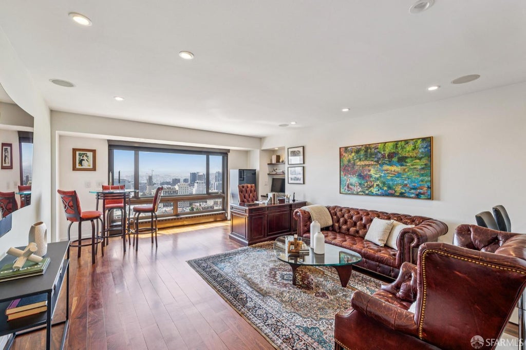 Luxury living at the top of Nob Hill with million-dollar views. Designer condo at Gramercy Towers. This impeccably renovated residence blends luxury, comfort, and iconic San Francisco views. A granite entry opens to a sunlit living space framed by sweeping southern vistas. The open layout includes a floating office, perfect for work or relaxation. The stunning kitchen features illuminated stone counters, rich backsplash, custom cabinetry, built-in spice rack, while the entry features twin crystal chandeliers. Walnut engineered floors, recessed lighting, and double-insulated, soundproofed walls and ceilings ensure serene living. The spa-like bath boasts a marble shower, glass doors, Toto toilet, towel warmer, and tall medicine cabinet. Additional highlights include 2 cedar-lined California closets, custom bedroom shelving, technology control center, hidden wiring, 8 HOA-approved ceiling speakers, and automatic day/night double blinds. Furniture available separately. Full-service building with 24/7 concierge, laundry, gym, sauna, spa, pool, steakhouse, and 1 spacious parking space.