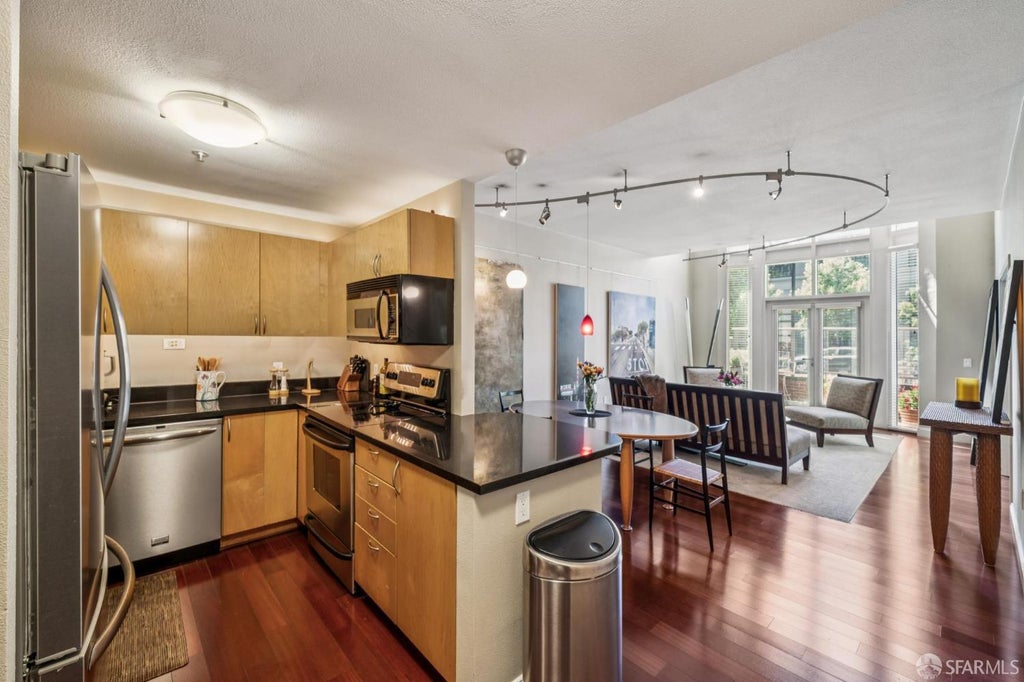 Residence 114 offers a rare, fully furnished, two-level, 2-bedroom, 2-bath home featuring a versatile layout, with the second bedroom thoughtfully set up as a home office. The open floor plan showcases wood floors, expansive floor-to-ceiling windows, dry bar with wine coolers, built-in speakers and direct access to a private walkout patio. The modern kitchen is equipped with sleek appliances and contemporary cabinetry, seamlessly flowing into the living and dining areas. Upstairs, the spacious primary suite boasts an en suite bath and a large walk-in closet and a brand-new washer and dryer add everyday convenience.Residents enjoy five-star amenities, including a pool and spa, fitness center, BBQ and outdoor fireplace, business/conference center, entertainment room, concierge services, and 24-hour security. Located in one of San Francisco's most desirable neighborhoods, 88 King St offers unbeatable access to shopping, entertainment, I-280, Caltrain, Mission Bay, Downtown, and the Bay Bridge.