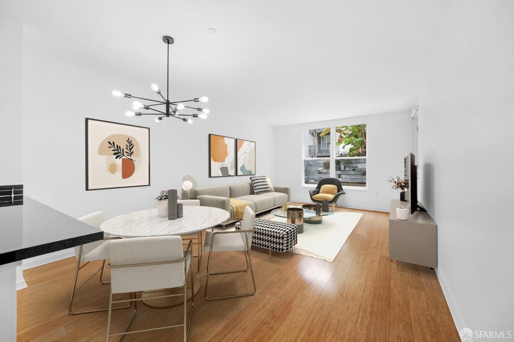 Just steps from Bayview Park and the T-Third light rail, this modern 3BD/3BA two-level condo combines comfort, convenience, and a serene setting. The main level features an open living and dining area with high ceilings, hardwood floors, and tall windows that bring in natural light. The chef's kitchen includes stainless steel appliances, ample cabinetry, and a bar-height peninsula for casual dining, while the living room opens to a spacious exclusive-use patio, perfect for entertaining or unwinding outdoors. Overlooking the quiet courtyard, the home is shielded from 3rd Street traffic noise yet remains bright and inviting. A bedroom and full bath complete this level, ideal for guests, office, or multigenerational living. Upstairs, two bedrooms include a generous primary suite with walk-in closet, faux brick accent wall, and en-suite bath with dual vanities. The third bedroom is served by a full bath, with a laundry closet and stackable washer/dryer conveniently nearby. Includes 1-car garage parking with shared EV charger. This secure, pet-friendly building is impeccably maintained and ideally located near 101/280, with local favorites Craftsman & Wolves, Gratta Wines, Laughing Monk Brewing, Frank Grizzly's, Flora Grubb and Mi Rancho Supermarket right in the building.