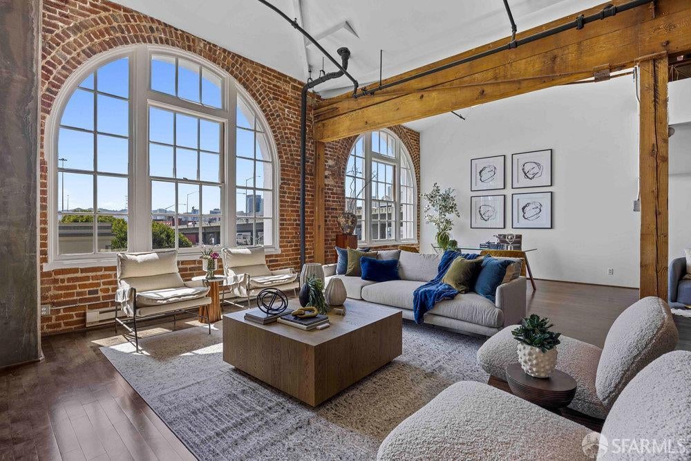 Set within the historic Clocktower Building, originally home to a lithography company and converted into a live/work condo development in 1992, this 1-bedroom, 1.5-bath corner loft celebrates the building's industrial past with original brick and timber elements, thoughtfully reimagined by architect David Baker. The wide, open floor plan, soaring ceilings, framed by the exposed beams, and oversized arched windows give this beautiful home a spacious feel, with hardwood floors and crisp white walls adding a clean backdrop for art and living. The updated kitchen features rich wood cabinetry that stretches to the ceiling, stainless steel appliances, and a generous island that doubles as a casual dining spot or a place to gather with friends. The main level also includes a full bath with contemporary finishes, as well as a washer/dryer for added convenience. The upstairs living space, with bedroom, walk-in closet, and sleek modern bath, feels like a hidden retreat. Parking is included with the unit. Amenities include a roof deck w/spectacular views,& a lush common area courtyard.94 Walk Score and 100 Transit Score, close to top dining, retail, cafes, & farmers market.Close to South Park,Oracle Park, the Embarcadero, Chase Center, Caltrain, Muni,& freeways. Property is not staged.
