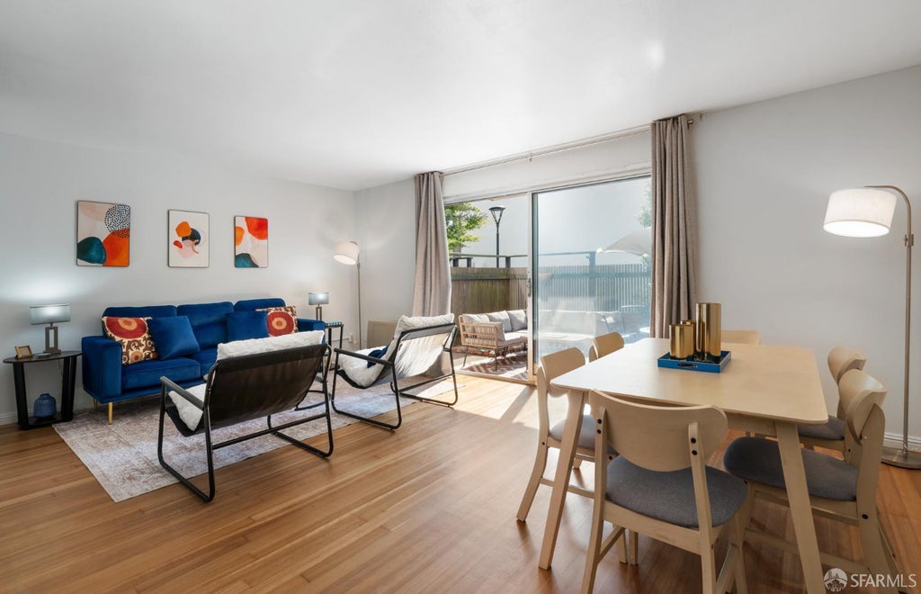 This incredible offering provides warm, sunny, wonderful indoor/outdoor living with two-bedrooms, parking included, located in between Hayes Valley and Fillmore, one-block to Japantown. Ground-floor and not sharing walls with any neighbors (only above). Large open-concept living and dining room with large sliding glass door to a spacious, south-facing patio with plenty of room for lounging, dining, and gardening with already existing mature flowering camellia tree, fantastic for entertaining or just relaxing. Recently refinished beautiful hardwood floors throughout. Kitchen with new stainless appliances-including and one of the few units with a dishwasher - offers full-height cabinetry and new lighting. Long hallway separating entertainment and private spaces provides two large walk-in hallway closets for additional storage. Two bedrooms with spacious closets, bright sky outlooks, and continued refinished hardwood floors. Abundant closet space and freshly painted throughout. All, yes, all utilities and parking included in monthly dues (vs paying separately for each with changing utilities costs elsewhere). Prime location close to Japantown, Hayes Valley and Fillmore district. (Some virtual wall art added for marketing.)
