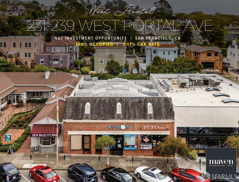 231-239 West Portal Avenue presents a rare opportunity to acquire a fully leased commercial asset in one of San Francisco's most established neighborhood corridors. The 5,200 SF two-story property features three ground-floor retail suites plus an upper-level retail/office space with abundant natural light and 50 feet of prime street frontage. Currently 100% occupied with leases extending through 2035, the asset provides stable long-term cash flow with minimal rollover risk. In-place income totals $261,036 annually, reflecting a strong 7.17% cap rate. The tenant mix includes Mighty Pilates, which occupies both the ground floor and second level; Kumon Math & Reading Center, a global educational operator; and TuTu School, a boutique ballet school franchise. Tenants benefit from long-term leases with annual rent escalations and expense reimbursements, further supporting consistent net operating income. Positioned adjacent to the West Portal Muni Metro Station, the property sits in a high-barrier-to-entry market with strong demographics, daily foot traffic, and loyal neighborhood patrons. This combination of credit tenancy, durable income, and irreplaceable location makes 231-239 West Portal Avenue an attractive investment for buyers seeking secure yield on San Francisco's west side.