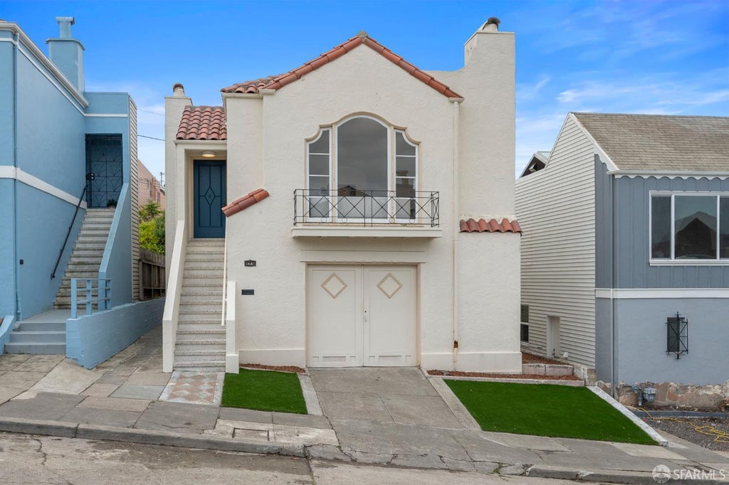 This fully-detached Spanish Mediterranean home radiates timeless San Francisco charm from the heart of the Portola district. Classic 1940s details with original parquet wood floors and walnut inlay, arched doorways, tray ceilings, and original wood doors, create a warm, elegant backdrop throughout. The formal living room features arched windows with a Juliet balcony and a striking fireplace, flowing into a bright, spacious dining room ideal for gatherings. Beyond, French doors open to a cheerful breakfast room with skylight ceiling bathing the home in natural light. Upstairs are two generous bedrooms overlooking the garden, a vintage kitchen, a pastel-tiled bath with separate tub & shower, and ample natural light throughout. A versatile lower-level bonus room with half bath offers flexibility for a guest suite, home office, or media room. The sunny backyard includes a flat patio and raised garden beds, perfect for outdoor entertaining. Finished with an oversized 2-car garage plus driveway parking, W/D hookups, endless amounts of storage space or substantial expansion potential. Only minutes to McLaren Park's 312-acre park, golf course, pool, tennis courts, sports fields & 7 miles of walking trails and 101/280 freeway access, making this a super accessible place to call home.