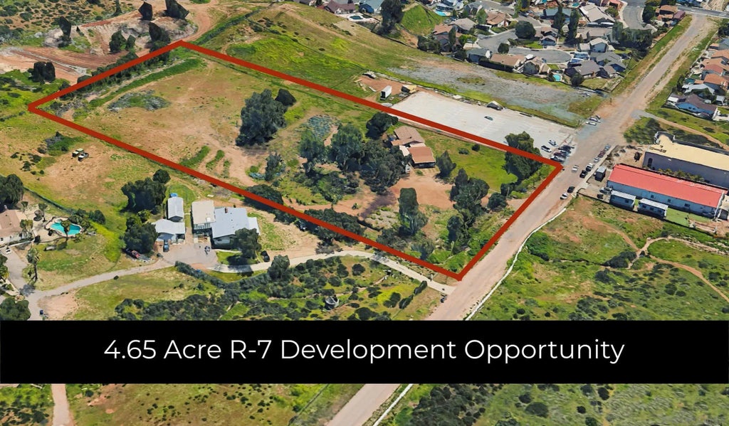 4.65 Acre R-7 Housing Community, Townhome, or Multifamily Development Opportunity. Parcel was recently approved for up-zoning to R-7 by the City of Santee as part of the 6th Cycle Housing Element. R-7 Zoning allows for 7 to 14 units per gross acre. It is a Medium Density Residential General Plan designation. Per the city's zoning code, the R-7 zone "is intended for a wide range of multiple family residential development types including detached units in planned residential development at the lower end of the density range and attached units at the higher end of the density range." Maximum lot coverage is 55%, maximum height is 35 feet/three stories, and there is no minimum lot size. NEW CONSTRUCTION COMMUNITIES IN DEMAND! Property is located in close proximity to in demand housing development communities such as Mastercraft Residential's Walker Trails, Summit Santee's Noble Way, Pardee Homes' Castlerock, Kb Homes' River Village and townhome/condominium development communities such as Presidio Cornerstone's Laurel Heights, Pardee Homes' Weston, City Ventures' Caribbean Way, Kb Homes' Prospect Fields, and William Lyon Homes' Riverview, just to name a few. Recent New Construction Community Home sales boast a closing range between $905,500 and $1,300,000. Recent New Construction Townhome/ Condominium Communities boast a sales closing range between $738,000 and $964,000.00