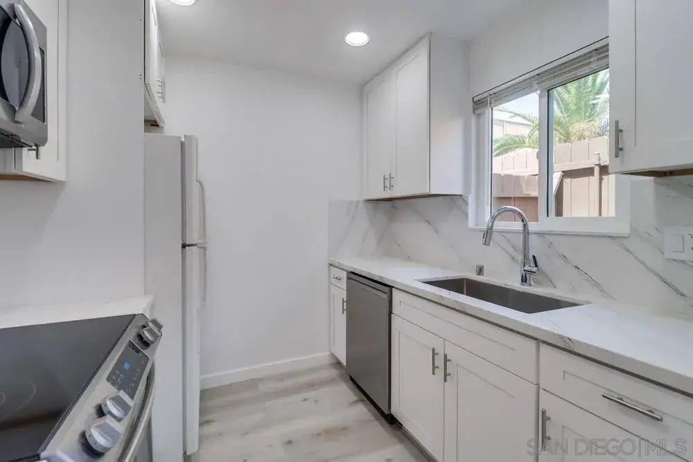 Newly Remodeled Town Home! Light and Bright! New windows and quartz countertops are in the kitchen, and there is a large backsplash. Stainless steel appliances and new kitchen cabinets. Vinyl wood flooring throughout, with recessed light in the living room and dining room. Large primary bedroom and second bedroom with new ceiling fans in each room. Stackable washer/dryer hookups in the unit. Newly upgraded bathrooms with new cabinetry, quartz countertops, and a tiled shower. HOA includes water, sewer, and trash.