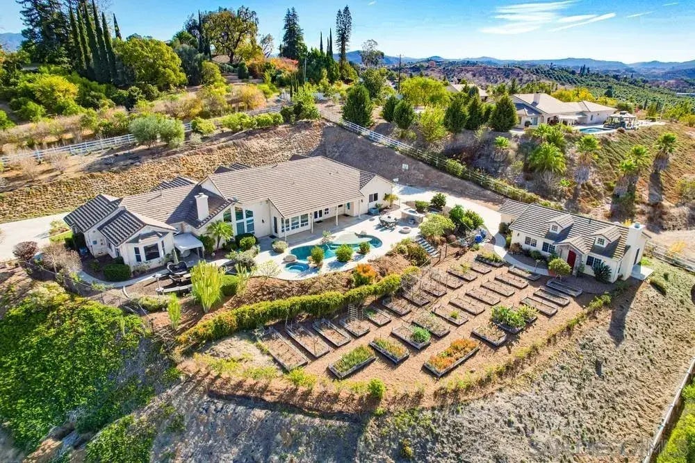 Spectacular single-story Fallbrook home with a detached ADU/guest house, situated on 2.53 acres of usable land. This 4,700 SqFt residence boasts 5 bedrooms, 4 full bathrooms, and 1 half bathroom, with expansive mountain views. The open concept main living space features a great room with tall, vaulted ceilings, a fireplace, and abundant natural lighting. The large kitchen is equipped with granite countertops, including two islands and two sinks, ample barstool seating, a walk-in pantry, and stainless steel appliances, including a double oven. Adjacent to the kitchen is a dining area with two doors leading to the exterior, and an additional living room off the great room. A bonus recreation room, currently used as an exercise room, includes French doors opening to the exterior patio and an built-in entertainment center. The primary ensuite offers a spacious bathroom with a dual sink vanity, a whirlpool soaking tub, and a walk-in closet, as well as sliding doors leading outside. Nature lovers will appreciate over 400 fruiting trees, shrubs, vines, and canes, supported by a fully automatic irrigation system with two clocks, each having 24 zones, and furtigator readiness. The property also includes 29 wooden boxed raised beds with automated irrigation, over 100 feet of specialty shrub roses for distillation into perfume, more than 100 aloe plants, and various other plants and orchards.