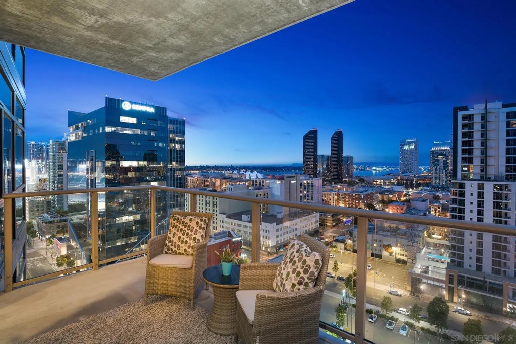 PRICED TO SELL! Experience unparalleled luxury living in the heart of East Village with this stunning 18th floor SW corner condo at The Mark. Revel in breathtaking panoramic views stretching from Downtown San Diego to Petco Park, Coronado, and the bay. Residence 1808 boasts a thoughtfully designed open floorplan with split bedrooms, ensuring every inch maximizes the awe-inspiring vistas. Recently renovated to the highest standards, the residence features a chef's dream kitchen complete with designer cabinetry, exquisite quartzite countertops, and top-of-the-line stainless steel appliances. Modern touches like recessed lighting, ceiling fans, central air & heat, primary bedroom with finished walk in closet and new vinyl plank and wood flooring throughout enhance the ambiance of luxury. Step outside onto the expansive balcony to soak in the sights and sounds of the vibrant city below. The Mark sets a new standard for urban living with its comprehensive amenities, including 24-hour security and concierge service, a salt water pool and spa, a state-of-the-art fitness center, and multiple BBQ areas. Residents also enjoy access to a conference room, secured parking with two spaces allocated to this unit, and a large storage unit. Positioned in one of San Diego's most coveted neighborhoods, this is an opportunity not to be missed for those seeking convenience, entertainment and the ultimate in luxurious urban living.