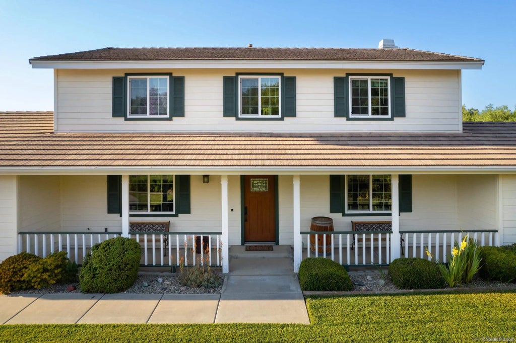 This custom-built house is situated on 2.55 acres of flat land, offering ample room for outdoor gatherings. Possibility for an ADU, a vineyard, or even an equestrian horse arena. It features a pool, next to a stylish deck. Did we mention the pool solar panels? It is surrounded by beautiful landscaping including orange and lemon trees. Be ready to unwind on the porch and enjoy the serene views of the surrounding area. Inside, the kitchen is thoughtfully designed to maximize storage capacity. Enjoy getting cozy in front of the wood burning fireplace on chilly days. This spacious 2,630 sq. ft. home includes 6 bedrooms, with the master bedroom being downstairs. Large windows throughout the house allow natural light to flood in, further enhancing the stunning views from every room. This property offers a perfect blend of indoor and outdoor living, with a pool, a shed, wood burning fireplace, 6 bedrooms, porch in both the front and backyard, on flat land, and with beautiful views.