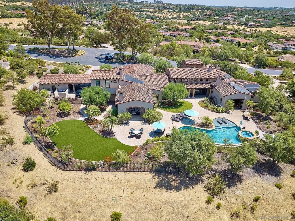 An extravagant single level estate in the highly desirable gate guarded community of Santaluz. Pride of ownership exudes from this rare offering in this price point, recently updated to provide an exceptional living experience designed by Scott Grunst. The estate, set on a private canyon frontage, features a primary suite, three ensuite guest rooms, a strong formal study finished in wood detail, home theatre, and an over garage private ensuite studio for a gym or hosting guests with direct access. The detailed front doors greet you as you enter into the grand formal reception living area, adorned in custom finished beams, with grand high ceilings, a strong fireplace with a generous formal dining area. A thoughtful primary suite features outdoor living access and walk out patio areas, a primary bath with a custom copper claw tub, added tile ledge, newer light fixtures and chandelier with blackout blinds for peaceful soaking moments. A kitchen fit for a passionate chef, recently updated Viking appliances, dual dishwashers, refrigerator, sink, stove, walk in pantry, custom painted cabinets, new quartzite surfaces, and chandeliers. A custom wine room will host approx. 400 bottles in a temperature controlled environment. An elegant updated wet bar appointed in new quartzite and granite counters, new wine fridge and pendant lighting. A well appointed home theatre, recently updated with robust sound system, new projector and finishes. From the great room, seamless outdoor living with substantial pocket doors with flowing access to the glamourous loggia adorned in newer fixtures