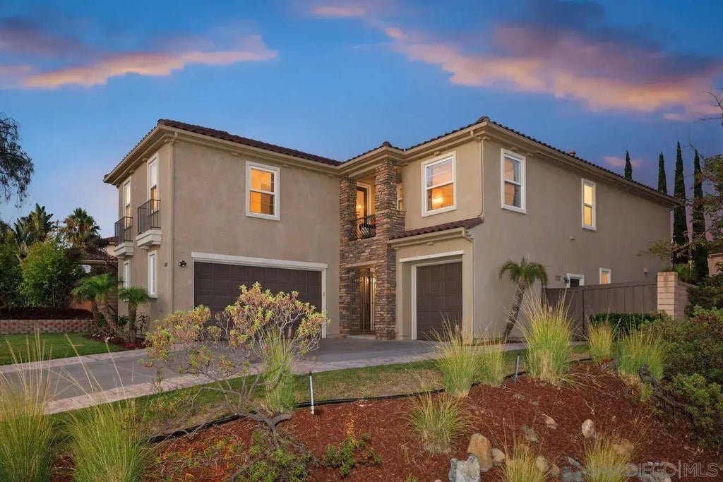 Centrally located on a corner lot in Carmel Valley, Wild Horse plan 3 home basks in natural sunlight. As you enter through the gated covered patio, you're greeted by an inviting interior featuring light tile flooring throughout the downstairs and elegant crown molding in the main living spaces. The open living and dining areas are enhanced by large north-facing windows bringing in ample filtered light. An adjacent room serves as a versatile office or bonus space. Beyond the striking stairway, you'll find a butler’s pantry with a deep coat closet leading to a spacious kitchen. This culinary haven features dark granite countertops, maple wood cabinets, and stainless-steel appliances. A large walk-in pantry provides ample storage, while a center island with a vegetable sink and bar seating offers convenience. The kitchen extends to an informal dining area with French doors opening to a back patio and a generous family room, anchored by a gas fireplace and lined with windows overlooking a private backyard adorned with mature Cypress trees. Additional features on the primary level include a powder room and access to a single-car garage near the kitchen, along with a two-car garage at the front entry. Upstairs, neutral wood laminate flooring complements the light wall color. The large primary suite offers multiple south-facing windows with neighborhood views. The spacious primary bathroom includes neutral tile flooring, light stone countertops, dual sinks, a vanity, a large soaking tub, a step-in shower, and a huge walk-in closet with dual entry doors.