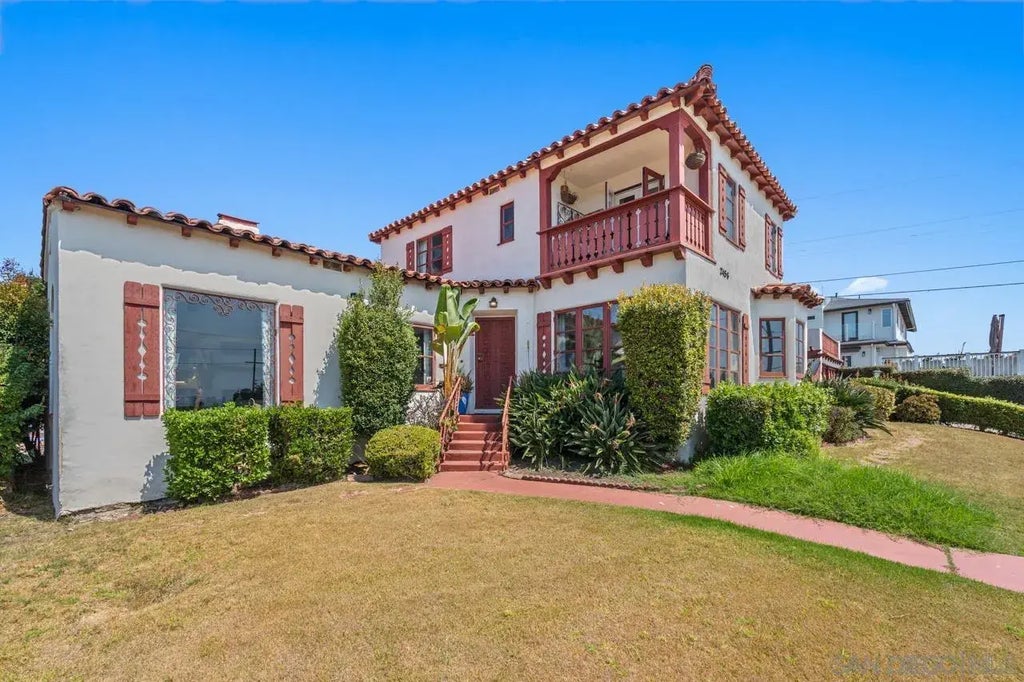 This wonderful Spanish Revival home has spectacular views of the San Diego skyline, bay, and the Coronado bridge.Boasting hardwood flrs,vaulted wood beam ceilings,arched windows,as well as decorative wrought iron in the living room.A darling breakfast room,original tile in the baths,and a Batchhelder mural tile fireplace mantle.The rear courtyard is a warm & inviting outdoor space.A detached guest suite is above the garage.1 bedroom is located on the first level of the home with a full bath. Two additional bedrooms and a full bath are located on the 2nd story.