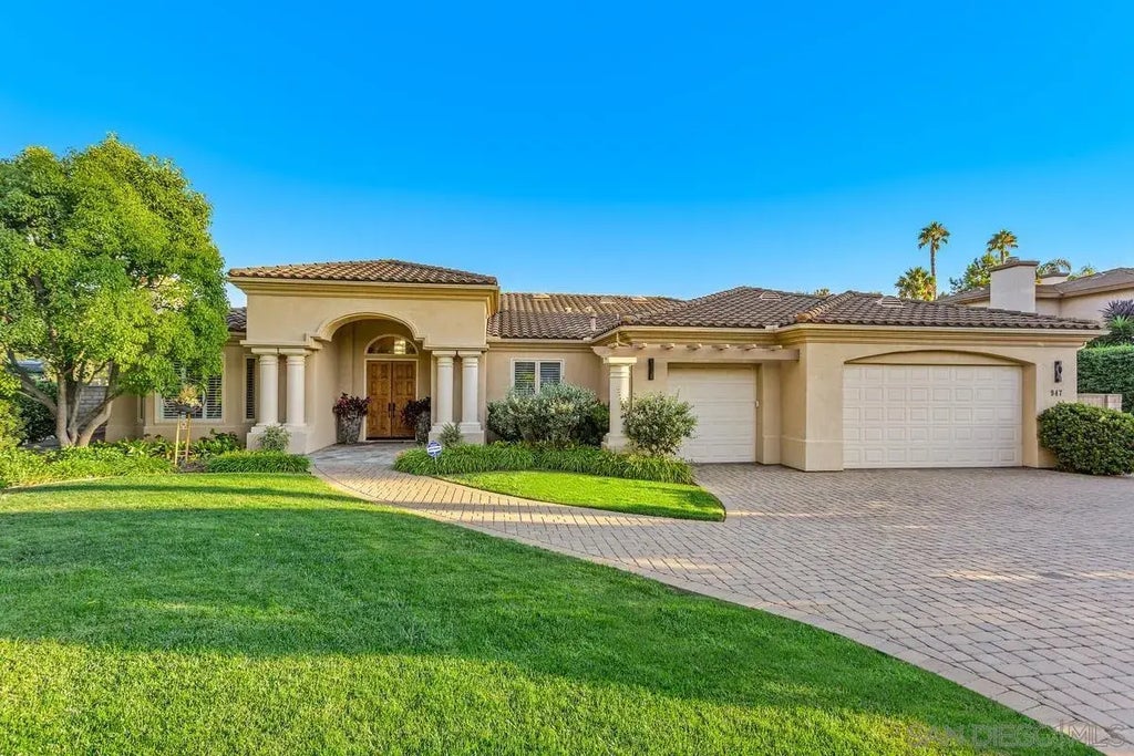 Nestled within the serene enclave of Olivenhain, this elegant Single Level residence is situated on a picture perfect park-like .55 acre lot. Step inside to discover rich wood floors, custom cabinets and molding, a testament to the finest construction and materials. The grand foyer has soaring ceilings, flanked by a formal living room with fireplace and dining room with views of the yard. A spacious executive office/library has custom built-ins beautifully crafted for function and enjoyment. Create gourmet meals in this open concept kitchen featuring high-end appliances, slab granite counters, a large center island and bar area that flow into the great room with a fireplace and custom screened double doors leading to the backyard creating indoor/outdoor living at it's best! Soft color tones are soothing and compliment the high ceilings and rich hard woods. The spacious primary retreat has a sunny sitting room with doors leading to the pool and spa, a walk in closet and a jetted bath offering a haven for rest and relaxation. Outdoor entertainment is truly magical with a sparkling pool and spa. Unwind in the gazebo with a wood burning stone fireplace, specialty cafe lighting and an outdoor kitchen, ideal for hosting gatherings large or small. Enjoy a raised garden and fruit trees incl. oranges, lemons, limes grapefruit, passionfruit and more! OWNED SOLAR for the home and pool provide for the lowest bills imaginable while living with sustainable comfort and enjoyment. Don't miss the opportunity to experience the luxury and tranquility of this remarkable property.