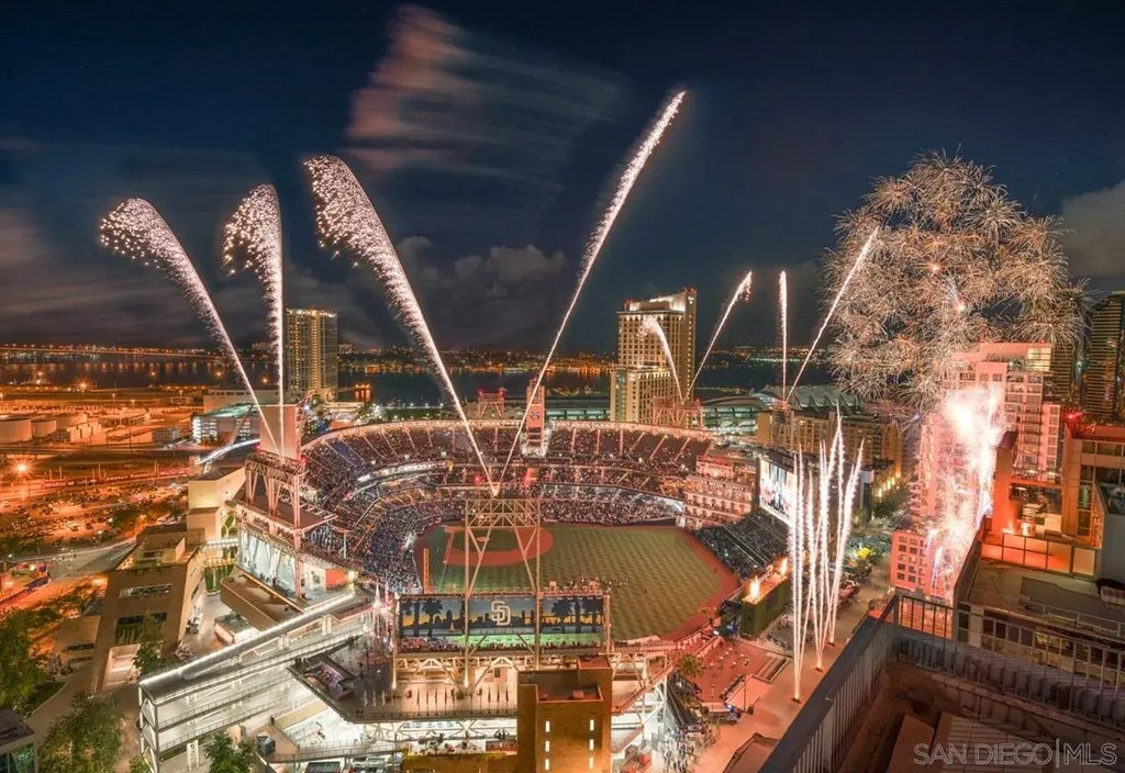 TRUE TOP FLOOR PENTHOUSE UNIT. Dual balconies off the living room and master bedroom, Coronado Bridge water views to the south and Balboa Park to the north. Incredible rooftop SkyBox that looks directly in the stadium with BBQ's, TV for viewing and lounge cushions for laying out. New hardwood flooring, granite countertops, custom master bathroom shower high speed webpass wifi, TV's and everything you need to move in with just your suitcase. ICON has it all: SkyBox (observation deck w/BBQ), lounge, fitness center, theater, 24 hr. security/concierge and proximity to SD's finest restaurants, bars and entertainment!