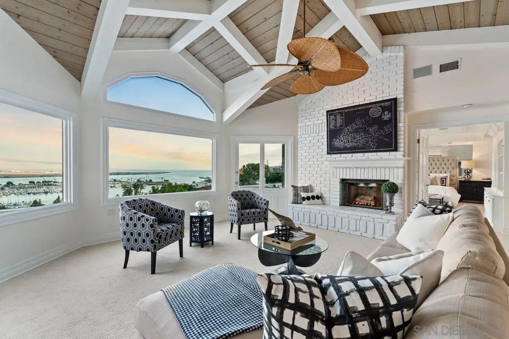 Experience breathtaking panoramic views that rank among the very best in Southern California. This sophisticated and elegant home is perfectly situated on an elevated cul-de-sac in the scenic hills of Point Loma. The spacious living areas are accentuated by four fireplaces, creating a warm and inviting atmosphere. The gourmet kitchen, equipped with a Sub-Zero Pro series refrigerator, six burner Viking gas cooktop, and Wolf dual ovens, is perfect for the culinary enthusiast. Two entry-level and two upstairs bedrooms, including a luxurious primary suite, are all generously proportioned and designed to maximize privacy. An upper-level view office is ideal for working from home and to take in the ever-changing scene outside the large windows. The five-and-a-half bathrooms include a recently remodeled primary bath fit for royalty. Dual sinks with Dyson faucets / hand dryers, two private smart toilets, a steam shower, and a luxurious soaking tub complete the spa-like retreat. The home is designed to maximize the stunning views, with large windows in nearly every room that frame the picturesque scenery of the San Diego Bay, downtown skyline, Coronado, Mexico, and the Pacific. The expansive front and rear decks provide the perfect setting for outdoor entertaining or simply enjoying the mesmerizing views. This estate spans over 4,400 square feet of living space on an estimated 8,190-square-foot lot, providing ample space for both relaxation and entertainment. Don't miss the rare opportunity to own this exceptional Point Loma residence with unrivaled views!