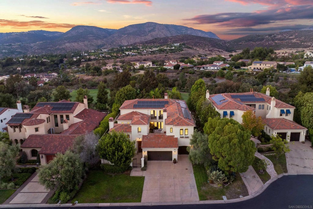 Luxury living at the guard-gated Crosby of Rancho Santa Fe,gracefully perched above the 1st Fairway, unobstructed Views of the Golf Course and Mountains. Spanning appr 4,265 SF. on quiet Cul de Sac boasts 4 BR plus an optional bedroom used as an office and 3.5 baths, offering unparalleled blend of elegance and comfort.Be captivated by the grand foyer leading to a formal living room with soaring ceiling and a cozy fireplace. The formal dining room, adorned with floor-to-ceiling silk curtains, exudes sophistication. The heart of the home features a stunning kitchen with a large island and breakfast bar, seamlessly flowing into an open-concept family room with built-in shelves and a cozy fireplace. The custom-built office/library on the main floor is perfect for work or relaxation, while the private outdoor courtyard with an intimate fireplace invites you to unwind. Upstairs, the opulent Master Suite offers direct golf course views from a spacious balcony, and a luxurious en-suite. 3 additional bedrooms provide ample space for family and guests. The meticulously designed backyard is a serene oasis, featuring LED lighting, drought resistant landscaping, and a Marquis in-ground spa. Modern upgrades include travertine floors, plantation shutters and a OWNED 32-panel solar system with remote monitoring. Enjoy exclusive access to the Crosby Golf Club , incl an 18 hole golf course (by membership) clubhouse, sports center, swimming pool/spa, and tennis courts. The Crosby offers numerous parks throughout the community for residents to enjoy.