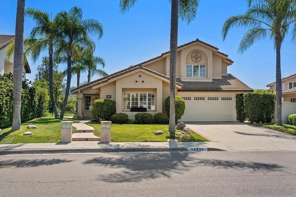 Spectacular easterly views define this one-of-a-kind property located in the Montelena community of Rancho Bernardo! Built on more than 1/3 acre, this beautiful home features countless upgrades – wood flooring throughout the main level and upstairs, vaulted ceilings, remodeled bathrooms, stainless steel appliances, pantry off kitchen, large living and family rooms, huge picture window and skylights providing ample sunlight throughout the home, ceiling fans, plantation shutters, Cat-5 / ethernet at all rooms, Master Bedroom and Bathroom located on the first floor, with auxiliary bedrooms and bath plus bonus room / den upstairs. Step outside to a backyard paradise – huge vanishing edge pool and spa that accentuate the view, full multi–use sport court, built-in barbeque, gas fireplace, stone accents at rear patio, pool / spa and fireplace, lush established landscaping with mature lemon trees. Other amenities include two storage sheds, metal and vinyl fencing, owned solar, rubber mat flooring and extra storage at garage. Close to freeway access, shopping and located in Poway Unified School District.