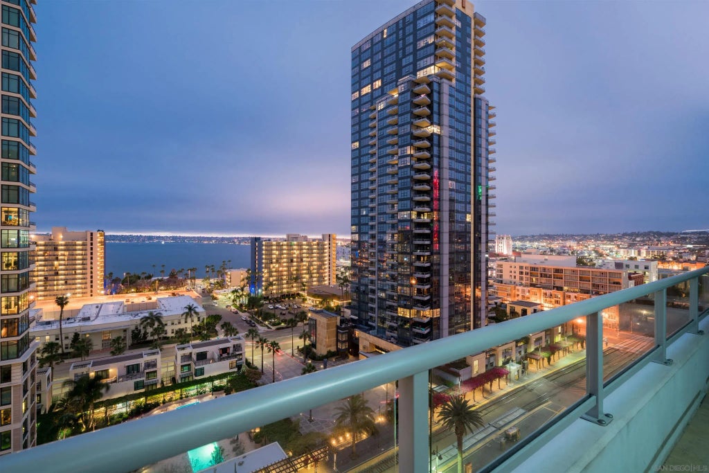 Discover unparalleled urban luxury in this southwest corner residence at the prestigious Sapphire Tower! Bathed in natural light from abundant windows, this home offers breathtaking blue water views of the San Diego Bay from your private west-facing balcony. Inside, you’ll find soaring ceilings, stunning wood floors, and exposed beams, creating a sophisticated and welcoming atmosphere. The gourmet kitchen is a chef's dream, featuring stainless steel appliances, including a Dacor oven, granite countertops, a stylish tile backsplash, recessed lighting, and a breakfast bar with elegant pendant lighting. Unwind in the spacious primary suite, complete with a luxurious ensuite bathroom. Enjoy dual granite vanities, ample cabinetry, a glass shower enclosure, and a soaking tub with a picturesque view window. Additional conveniences include an in-unit stackable washer and dryer, as well as two secured parking spaces (one with 240 wiring for electric vehicle). Experience elevated urban living in this stunning residence, where every detail is designed for your comfort and style. Welcome to your new home at Sapphire Tower!