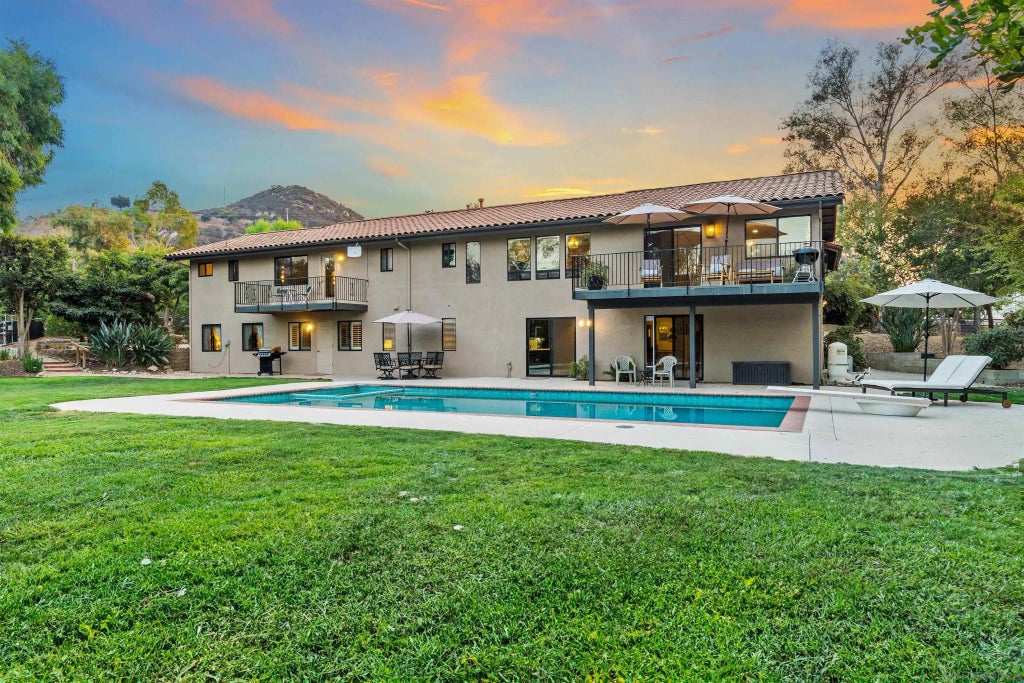 This beautiful hillside home is one of a kind with a multi-generational or ADU potential for all or part of the lower level which walks out to the pool level with views of the 2.25 acres with fruit trees and a rose garden. The home includes fully owned roof solar, dual HVAC-water heaters-laundry, for each level. The 2022 kitchen remodel will meet the desire of any chef with upgraded appliances, quartz counters, microwave drawer, and large 10 ft island with breakfast bar. The upper street level hosts 3 large bedrooms plus an office which could be a bedroom, a living room, an open dining room/family room area with an outdoor balcony/deck for barbecues. The master bedroom has a walk-in closet with laundry, a private balcony, and a huge master bath with walk-in shower, soaking tub, his and hers sink areas and plenty of storage. In 2023 the detached oversized 2-car garage was added near the entrance to the lower level level which has granny-flat/ADU potential, or just extended family living space. The lower level is approximately 1440 sf and includes a master suite with full bath, large walk-in closet, private living room and a separate entrance. The lower level also hosts a full laundry, full bath and a 34" x 15.5' bonus room including tile floor, a kitchenette, walk-in pantry, built in shelving, room for game tables, etc. with multiple sliding glass doors going out to pool and backyard. There is tons of storage located in the unfinished basement that runs the length of the home with inside and outside access.