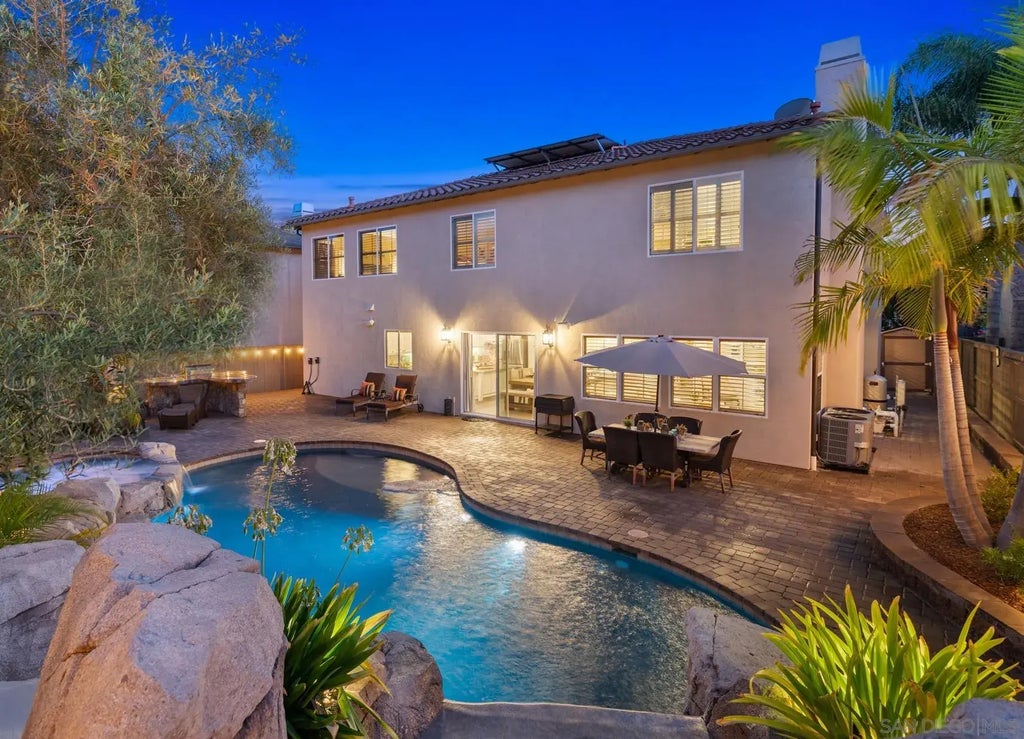 This entertainer’s paradise features a stunning saltwater pool & solar heating system, ensuring comfort & luxury year-round. You'll be greeted by an inviting atmosphere, spacious dining room & living room, & wood-look porcelain plank flooring—perfect for poolside living. The entry-level office, with built-in shelving & desks, creates an elegant & functional space ideal for remote work or daily tasks. The heart of the home is the beautifully designed kitchen & family room. The kitchen boasts white cabinetry, a gas range, & an oversized island. It opens up into the family room, adorned with custom built-ins & a cozy fireplace. The sliding door seamlessly connects indoor & outdoor spaces, leading to a backyard oasis. A saltwater pool, with solar heating, custom slide, & grotto tucked beneath a waterfall, promises endless entertainment, while the hot tub offers a serene retreat. Upstairs, discover 4 spacious bedrooms & a large bonus room. The primary suite boasts his-and-hers closets & a luxurious en-suite bathroom featuring dual sinks & a separate vanity. A versatile bonus room offers endless possibilities, like a gym, playroom, or theater. 3 additional spacious bedrooms & 2 full bathrooms complete the 2nd level. Zoned for award-winning Poway Unified School District schools, like Monterey Ridge Elementary & Del Norte High School, this home provides access to top-tier education. Boasting a 3-car garage, this residence offers convenient access to both Interstate 15 & Interstate 5. Now’s your chance to make this beautiful home your own!