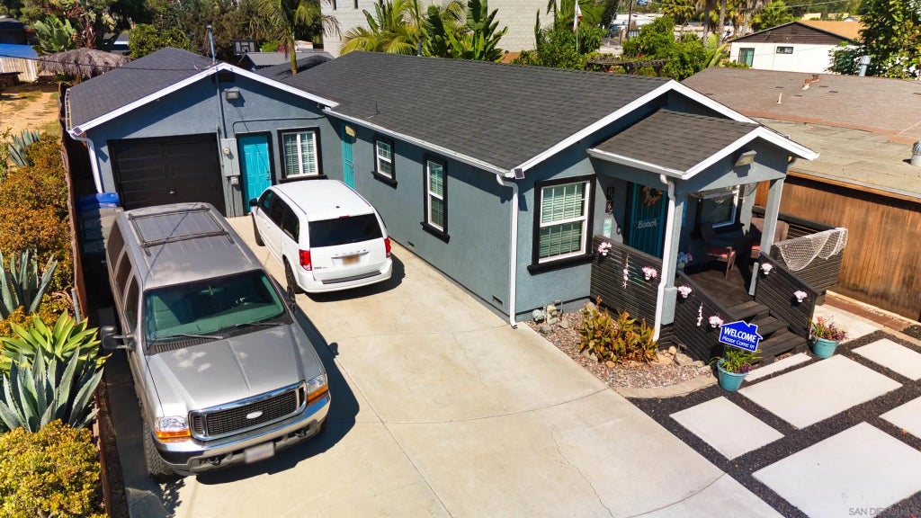 No need to go on vacation when you can live the San Diego outdoor lifestyle at this well maintained two-bed one-bath home that features two detached structures currently being used as a craft room and exercise studio. Newer roof, AC and driveway with room to add another bedroom and bath or utilize the HUGE yard for entertaining, recreation & pets. Full size stacked laundry near kitchen with lots of closet and attic storage. Approximately 1/2 of the two-car garage was converted to a bedroom that has direct access to home and driveway. The 1-car garage has a pass-through from the driveway to backyard through double doors. Driveway features hookups for an RV with sewer, electric and water. Two covered patios feature gathering spaces with a built-in bar and outdoor kitchen, hot tub, dog run, doghouse with solar cooling shed, fire-pit, garden fountain and fruit trees. Buyer to satisfy self as to square footage and room sizes. Great value for an owner occupied residence or possibly short term rental.