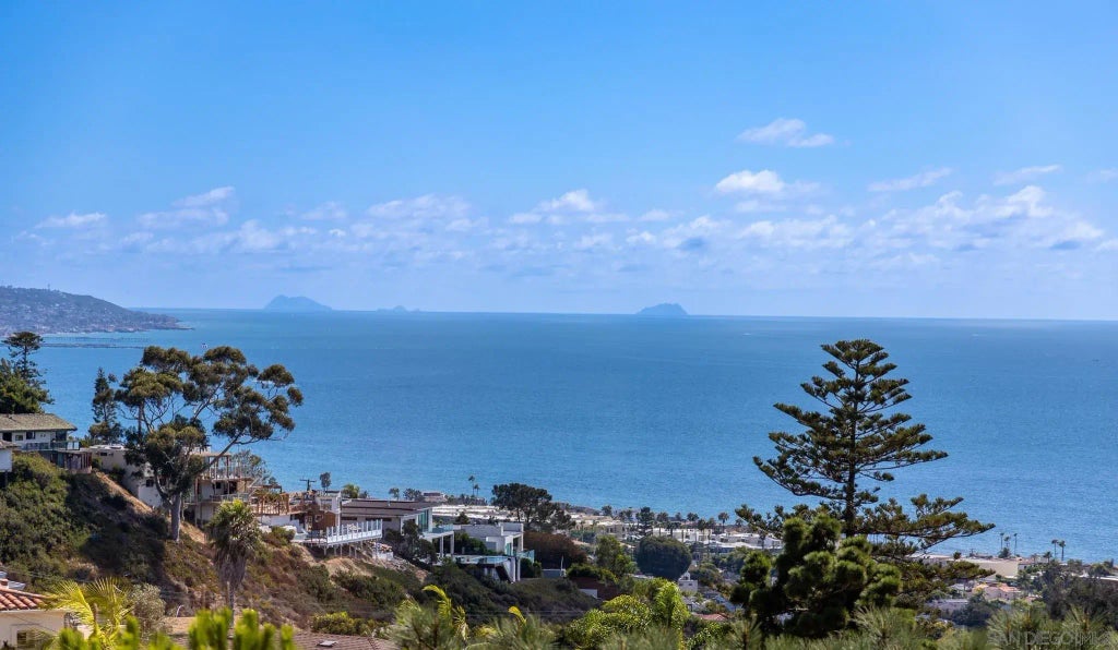 This exceptional contemporary home offers an unparalleled living experience with 180 degrees of picturesque sit-down panoramic ocean views. You also get gorgeous sunset views during the spring, fall, and winter months. This one-of-a-kind property lives entirely on the main level (like a single level-no steps) except for one bed/bath. Enjoy the serene coastal view backdrop from your grand living/dining great room with 12ft ceilings and abundance of natural lighting throughout. The gourmet view kitchen is equipped with a large center island, custom cabinetry, Dacor stove top, double ovens, pantry, breakfast area and a built-in work desk/station. Wake up every morning and enjoy the beautiful ocean views from your primary suite. The newly remodeled primary bath has two spacious walk-in closets, dual sink vanities with make-up station, separate soaking tub and stall shower. There's a separate indoor laundry room with lots of cabinetry and deep sink. Enjoy al fresco dining and relaxation while soaking in the picturesque scenery & ocean breezes from your large outdoor deck. Has air conditioning. This exceptional residence is the epitome of La Jolla living, making it the perfect place to call home.