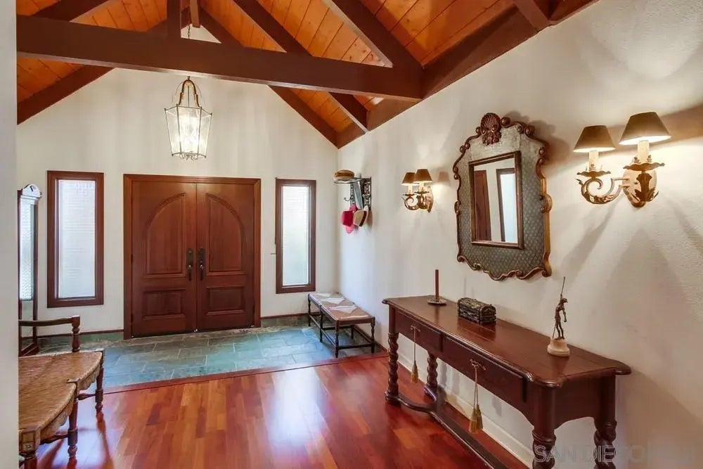 Magnificent custom one story English Tudor Revival in Del Mar Heights! Old world charm meets West Coast lifestyle....from the 22 custom designed solid mahogany doors & soaring open beam ceilings to the luxurious master suite & tropical island inspired "Tiki Hut" backyard retreat. The original 1970 Pardee home was removed to the slab, reimagined, and replaced in 1981 with this tranquil and luxurious detail-focused residence! Newly refinished solid merbau floors, Viking, Subzero, and slab granite kitchen, a world class primary suite with the epic Kohler DTV II "sound and light show" shower/steam system, Robern medicine cabinets with built-in video screen, sumptuous guest bath with master-crafted marble and tile, generous dining room suitable for a large family banquet, 2 bonus rooms upstairs not included in square footage, large additional walk-around storage attic, outdoor BBQ station with Viking Professional grill, workbench with tool chest & storage, firewood storage rack with custom waterproof cover...and more! Situated on a plateau high above the Pacific Ocean this neighborhood enjoys nature's air-conditioning and walking distance access to the priceless Crest Canyon Open Space Park with its wonderful dog-friendly trails. Walk to Torrey Pines State Park, Del Mar Village & Beach, and the San Diego County Fair & Racetrack. Enjoy this quiet enclave West of I-5 with its easy breezy access to the best Del Mar and the coast have to offer!
