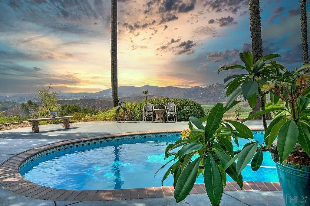 Discover the elegance of this stunning single-story home, offering breathtaking forever views. This exquisite property boasts luxurious finishes, including Venetian plaster, custom cabinetry, and beautiful drapes and window coverings, complemented by stunning hardwood flooring throughout. Indulge in the spa-like bathrooms featuring a steam shower, a clawfoot tub, Carrera marble countertops, and convenient towel warmers. The heart of the home is the gourmet kitchen, equipped with a Subzero refrigerator, a Wolf six-burner range, and a Miele dishwasher—perfect for culinary enthusiasts. Enjoy the practicality of dual-pane windows, EV hookups, and solar for energy efficiency. Step outside to your own private oasis boasting incredible views, complete with a saltwater pool and BBQ area, ideal for relaxation and entertaining. With California closets for organized storage and quartzite countertops adding a touch of luxury, this home truly has it all. Don’t miss your chance to own this remarkable retreat! Prior to Lake Hodges reducing its water level about 60% in 2022 for Dam repairs, this home had huge lake and water views. The lake will be refilled once repairs have been made.