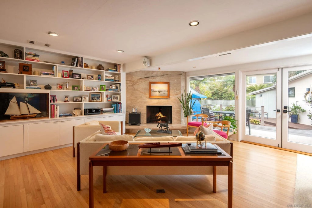 Designed to evoke nostalgia for the open sea, this single level mid-century home is an architectural dream with beautiful wood and tile floors, polished teak finishes, and unmatched craftsmanship. The over-sized primary bedroom includes a sitting area with fireplace, sleek rounded walls, and copious cabinetry. Strategically placed skylights are a highlight of the luxurious light-infused bathroom which features a doorless shower with bench, dual sinks, and heated floors while natural wood materials, multiple windows, and garden views combine to create a spa-like setting. There is a guest bedroom and full bathroom plus a separate sunroom which serves as the perfect flex room - use as an office, gym, or meditation room. The garage has been customized to include a refrigerated 600+ bottle wine room, an extensive work bench, laundry station with sink, and additional storage, while still retaining plenty of room to accommodate parking for one car. Brick patios and wood decks offer multiple sitting areas to enjoy the peaceful outdoors in this quiet, convenient location near Pt. Loma Nazarene and just minutes to the heart of downtown.