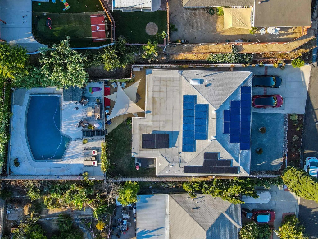Step into your eco-conscious oasis dream home with 30 owned solar panels, an electric car charger, and two powerful Tesla batteries (27 kWh total), you'll have peace of mind knowing your home is energy-efficient—even overnight. Additionally, the central AC and heat, whole house fan, along with an upgraded Rheem tankless water heater (2020), drought-tolerant landscape and energy saving appliances all help to make this a cost effective home. Designed for a seamless indoor outdoor living, the recently remodeled kitchen (2023) is a chef's delight, boasting sleek quartz countertops, ample storage, and a full suite of newer (2023) Bosch appliances. The large dining room is perfect for hosting memorable dinner parties. The newly custom-built buffet features real wood cabinetry and a chic quartz countertop and backsplash, with a built-in wine fridge and beverage cooler. Outside, the bi-level backyard creates the ultimate year-round San Diego lifestyle party zone. The lower level offers a dreamy setup for alfresco dining perfect for family get-togethers and reunions. Ready to relax? Sink into the brand-new hot tub (2023) housed on a professionally poured cement slab. The upper pool deck offers something for everyone. Whether you enjoy an invigorating dip in the pool or lounging in the sun or unwinding with some meditative yoga by a soothing fountain or a place to explore your inner green thumb in a thriving vegetable and herb garden or simply enjoy the tranquility of your oasis home, whatever the mood, this energy efficient home has something everyone. Welcome home!
