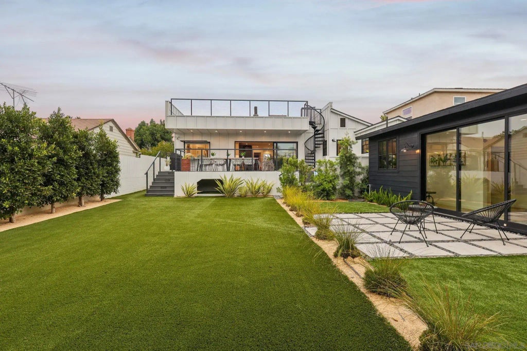 Welcome to the epitome of coastal San Diego living. This board-and-batten modern farmhouse has been completely renovated and includes a new detached guest house. An entertainer's dream, the home features a bright, open floor plan, crisp white palette, and warm wood-toned LVP flooring. The chef’s kitchen boasts an oversized island, stainless appliances, walk-in pantry, and a flip-out window opening to the backyard. The large living room offers a wet bar with wine fridge, custom cabinetry, and 15’ sliding doors for seamless indoor-outdoor living. Motorized shades provide privacy and perfect sunset lighting. The low-maintenance yard features Trex decking, a sunken conversation nook around a gas fire pit, and a water feature. Enjoy peek bay views and fireworks from the 750 sq. ft. rooftop deck. The spacious primary suite includes vaulted ceilings, a walk-through closet, reading nook, and a spa-like bath with imported designer tile. The detached backyard studio is a private oasis with a kitchenette, Murphy bed, built-in desk, mini-split A/C, and 12' collapsible door. It serves as a guest suite, office, or fitness center with its own private access. No detail was spared, with new Pella windows, updated systems, and low-maintenance James Hardie siding. Smart home upgrades include LED lighting, Nest thermostat, Ring security, and myQ garage. There’s even a dedicated dog bath and garage perfect for a golf cart. Live the San Diego dream in Bay Park, close to restaurants, breweries, coffee shops, and parks.