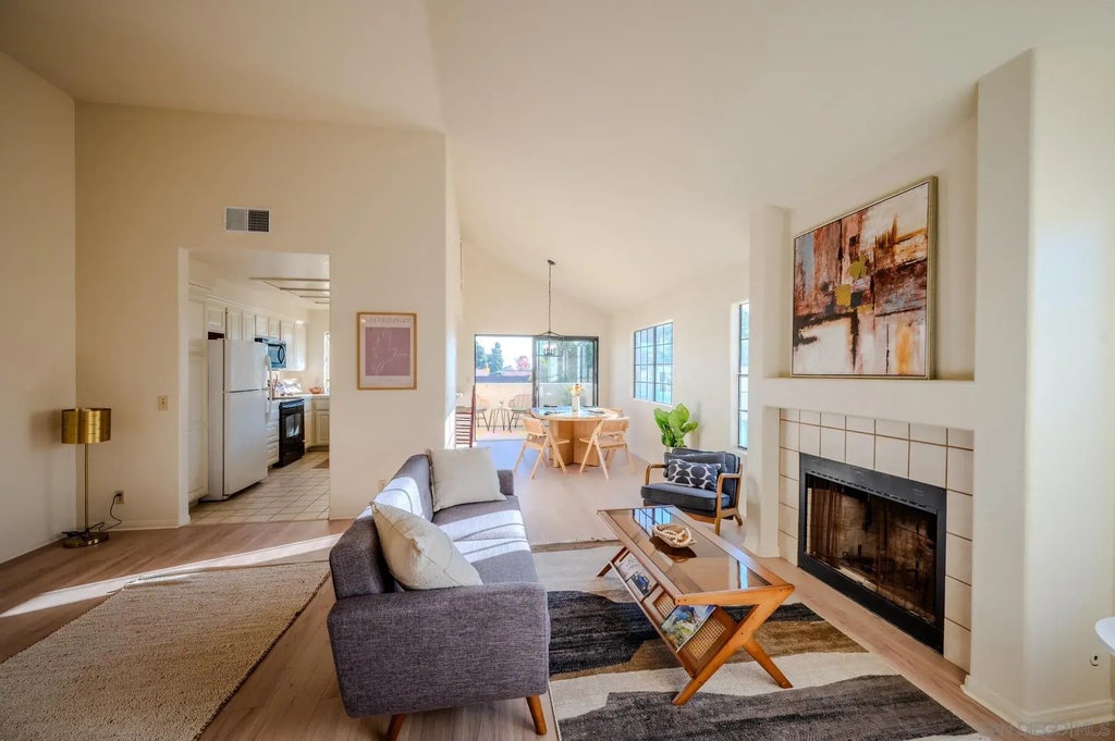 Lovely upgraded and remodeled 3 bedroom, 3 full bathroom spacious townhome, in desirable quiet residential area of Pacific Beach. Perfect for a family, or as a rental unit for 3 roommates. Very high ceilings in the oversize living area and in master bedroom provide a spacious, airy, sunny, light and bright feel. 3 full bathrooms are each en suite, so each of the 3 bedrooms has its own private full bathroom, without sharing or going out in the hallway. This townhome is completely updated for a clean modern look, with all appliances upgraded (from refrigerator to full size washer and dryer, and even a new high efficiency furnace), new flooring everywhere, new paint everywhere, new bathroom fixtures, new light fixtures. Large open floor plan with spacious living area, fireplace, and large bar for serving from kitchen. Kitchen layout is very efficient, and the kitchen sink looks outside through a bay window. Plenty of cabinets and storage. Townhome faces west for cool ocean breeze. Huge balcony faces south for catching sun’s rays. Very close to major shopping, restaurants, etc., and easy bike ride to beach. Excellent schools. Oversize 2 car tandem garage. You must see it in person, to appreciate how its rare very high ceilings give you a spacious, airy, bright feeling.