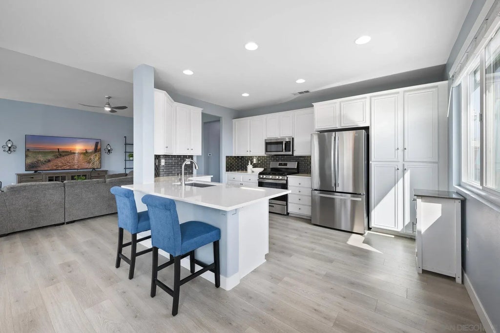 Welcome to Four Seasons Murrieta, a vibrant 55+ Active Retirement Community! Nestled on a corner cul-de-sac lot, this upgraded single-level home offers 3 bedrooms, 2 bathrooms, and an open-concept floor plan. Highlights include luxury vinyl plank flooring, quartz countertops, a designer kitchen backsplash, and stainless steel appliances. Newer vinyl double-paned windows. Newer water heater, angle stops, supply lines in bathrooms, kitchen, and laundry room. The elevated backyard is perfect for relaxing, featuring a new white fence and pergola. The spacious primary suite includes dual walk-in closets, double vanities and a soaking tub, creating a serene retreat within this beautiful home.