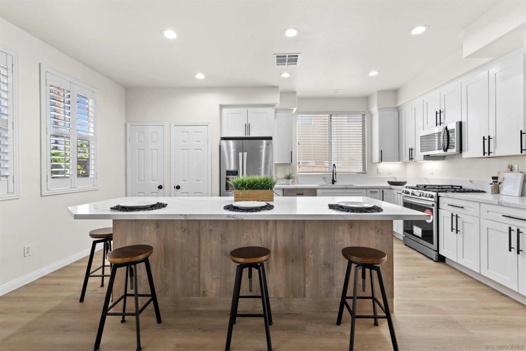 Discover modern elegance in this beautifully remodeled 5-bedroom, 3-bathroom home located in the gated Otay Ranch community. Spanning 2,950 sq.ft., this stunning property features a first-floor bedroom and full bath, making it ideal for guests or multi-generational living. The brand new kitchen, high ceilings, and stylish vinyl flooring throughout create a contemporary and inviting atmosphere. The spacious primary suite includes a private balcony, perfect for relaxing. Eco-conscious amenities include solar panels and a Tesla charger, compatible with other EVs. Fresh paint, modern vanities, new fixtures, and updated appliances enhance the luxury of this remodel. Enjoy the convenience of a low-maintenance yard and community perks like the pool, jacuzzi, and nearby Horizon Park. Plus, the community is secured with nighttime patrol for added peace of mind. With easy access to freeways, shopping, and top-rated schools, and low HOA fees of just $129, this home is ready for you to move in just in time for the holidays!