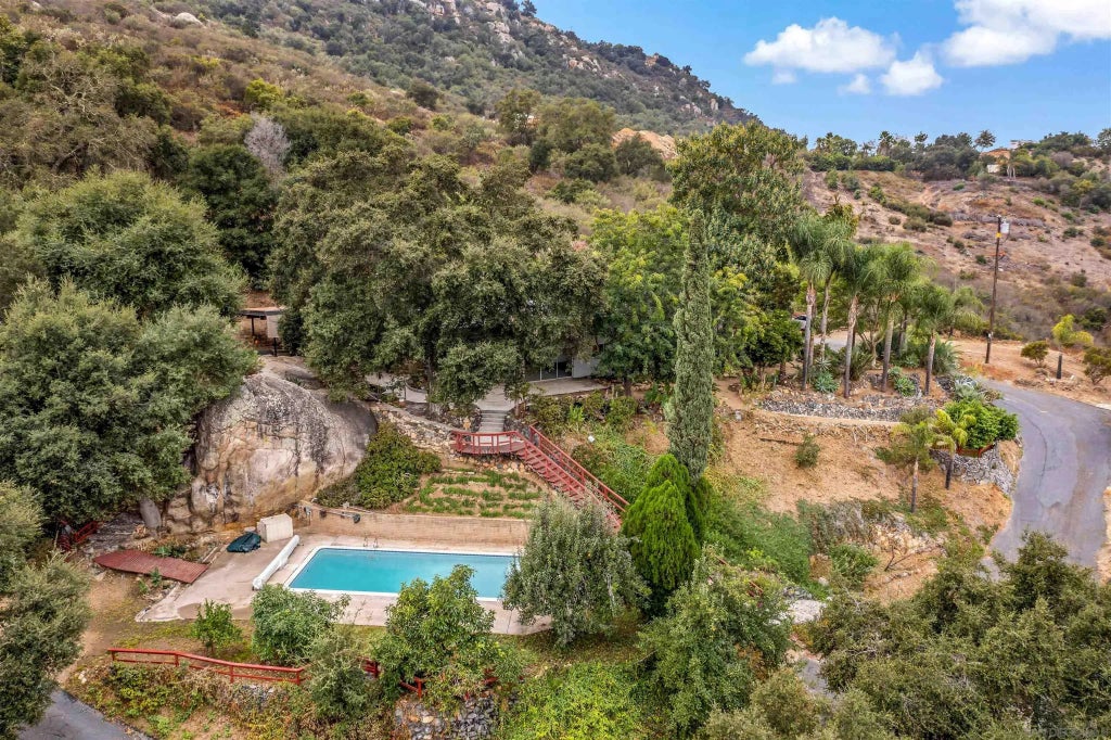 Peaceful country living with easy city access, minutes from Escondido and Valley View Casino. This refreshed 4-bed, 2-bath ranch home sits on 9.24 serene acres, offering spacious living and stunning views. Recent updates include fresh paint, new carpet, mini-split A/C, electric water heater, stainless steel range hood, and pool pump. The flexible layout features a great room with high ceilings, a brick fireplace, and space for formal living or dining. 13x11 Bonus room (not in tax assessor square footage) with its own entrance is perfect for an office, craft room, or play area. The galley kitchen includes ample storage, deep drawers, a pot rack, and a walk-in pantry/laundry. Large (14x14) primary bedroom has an ensuite, a wall of closets, and natural light. The huge (20x19) fourth bedroom, with built-ins and exterior access, is ideal for multigenerational living. Paid-off solar system. Outside, enjoy a tranquil pond with a rock waterfall, shady garden, and valley views. A built-in pool, framed by oaks and stone formations, is perfect for laps. The property also features fruit trees—lime, lemon, pear, apple, peach, avocado—and blackberry vines. The front courtyard includes a covered porch and new artificial turf, perfect for relaxing. Huge (30x15) 2-story workshop, storage sheds, plus an outbuilding with electricity and water. Covered parking accommodates three vehicles, including an RV or boat. Flat usable land on north end of property offers future development potential, and a new septic tank for RV hookups is installed (never filled/used).