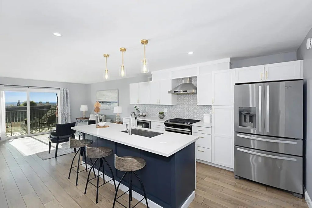 Welcome to this stunning townhome in the highly desirable Bay Ho neighborhood, where modern elegance meets breathtaking ocean views. Nestled within the Pacific Racquet Club, this beautifully remodeled three-level home offers the perfect blend of style & convenience. Enjoy breathtaking sunsets & a refreshing coastal breeze from your private ocean-view balcony, which offers the perfect setting for relaxation & entertainment. The top-floor kitchen is a chef's dream, featuring a large island w/ quartz countertops, custom cabinetry, & energy-efficient appliances. The kitchen seamlessly connects to the dining & family room, making it ideal for hosting. New energy-efficient Milgard windows, patio slider doors, & AC. The stylish interior boasts LVP flooring & contemporary fixtures throughout, complemented by a cozy gas fireplace in the family room for added ambiance. The large primary & secondary bedrooms share a beautifully designed bathroom on the middle floor, & both bedrooms come equipped with built-in storage for ample space. Elegant, modern bathrooms enhance the home's sophisticated feel. The lower level includes an oversized one-car garage w/ washer & dryer & plenty of storage space. Complex amenities include a pool, spa, & racquetball, enhancing your active and social lifestyle. Located w/ quick access to freeways & close proximity to the trolley, Mission Bay, and numerous beaches, this townhome offers the best of coastal living! Whether you're commuting or enjoying nearby attractions, you'll love the convenience and charm of the Bay Ho community.