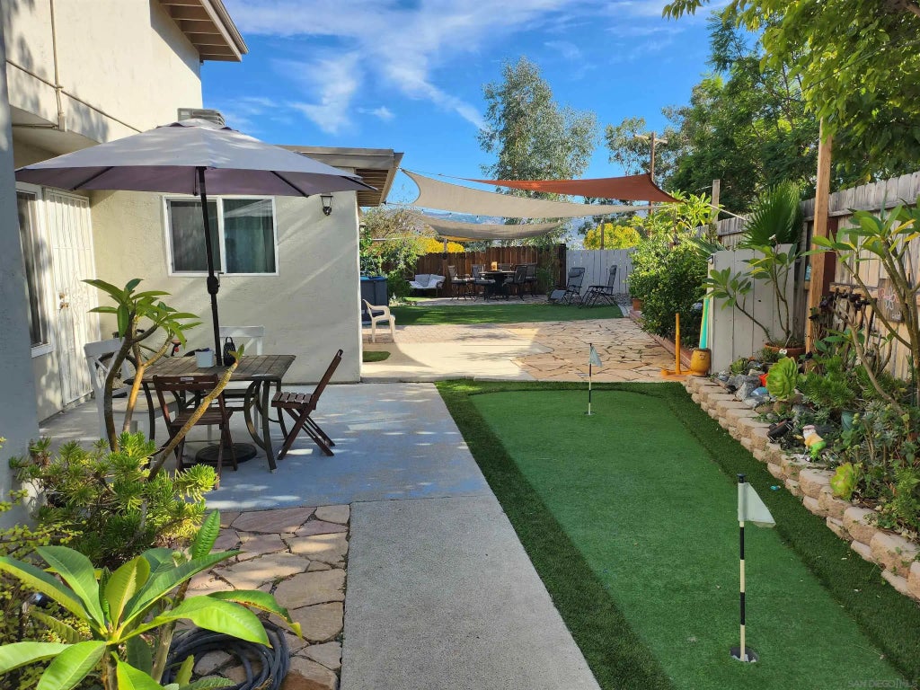 Welcome home to this spacious, well appointed residence tucked into the hills of Lakeside. One common wall but lives like a single family with large private yard, two-car garage with bonus storage space, and upgrades galore. Newer kitchen with smooth-edge quartz counters, farmhouse sink, custom USA-made cabinetry, stainless appliance package including range with double oven, and adjacent dining room with breakfast nook including extra built-in storage and slider to backyard. First level main bedroom with en-suite bath and walk-in closet, spacious living room with electric fireplace, three more bedrooms and upgraded second full bath upstairs with floor-to-ceiling tile, frameless shower doors, and rain showerhead. Light and bright with dual-pane vinyl windows, energy savings generated by a leased solar system that can be bought out by seller through escrow with a strong offer. Backyard is a fully-fenced private paradise – custom putting green and turf, mature fruit trees (grapefruit, tangerine, guava), beautiful flowering plumeria, and drought-tolerant succulents complete the landscape. Exterior was repainted in 2023 with a Truguard protective coating designed to last decades. Low HOA fee includes water, sewer, and trash bills plus maintenance of spacious park-like grass fields on each of the community’s private cul-de-sacs, access to community pool, and country park with basketball court and plenty of room for large gatherings. Short distance to Lakeview Elementary and in the highly-regarded Lakeside school district.