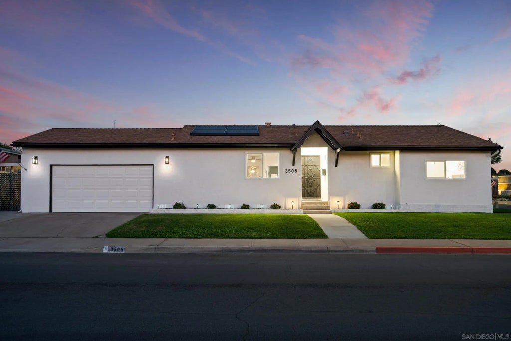 Charming, corner-lot home on a quiet street in Serra Mesa! Completely remodeled inside and out, boasting an open floor plan with a large family room that bring in tons of natural light, updated flooring throughout, a renovated designer kitchen with an island, ample storage space, and stainless steel appliances, custom bathrooms, a private primary suite separate from the other bedrooms, a secondary suite that is perfect for guests, SOLAR, and updated dual-pane windows. The exterior features fresh paint, sod and fruit trees in the front, a fully fenced backyard with a wrap around patio, turf, and an additional space that can be used for outdoor dining or storage for your boat/toys. No expense has been spared on this home. Hurry, it won't last long!