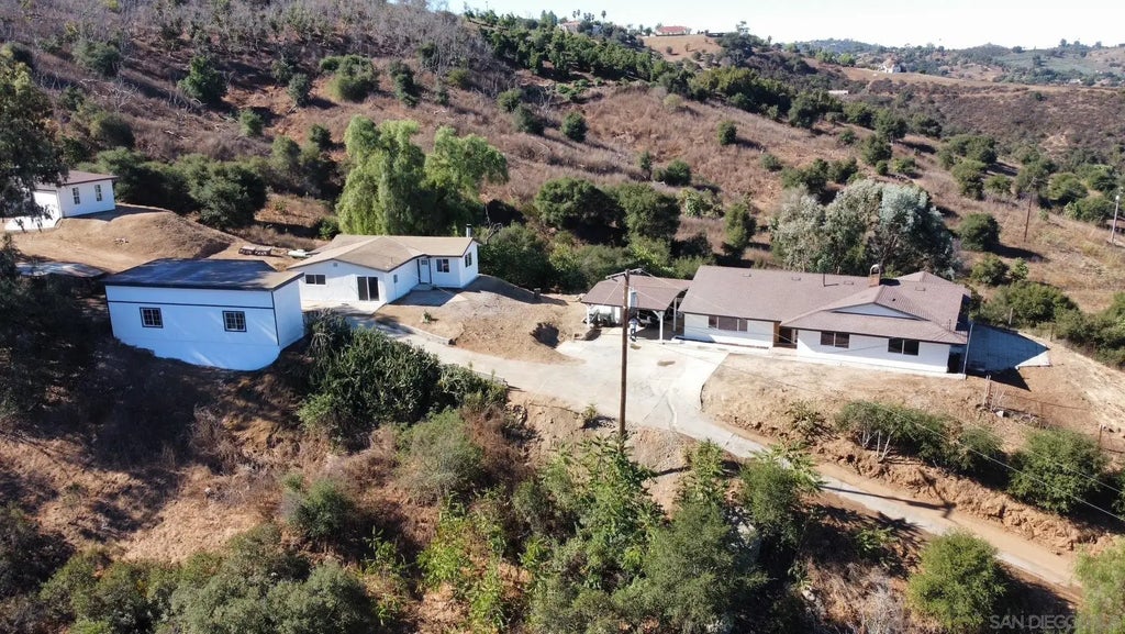 Over 10 acres, much useable land. Private & quiet location with panoramic top of the world views in almost all directions. Remodeled & upgraded light and bright, 2 homes both are legal with 2 separate huge garages, could have many uses, one could hold over 3 cars and the other over 11 cars.