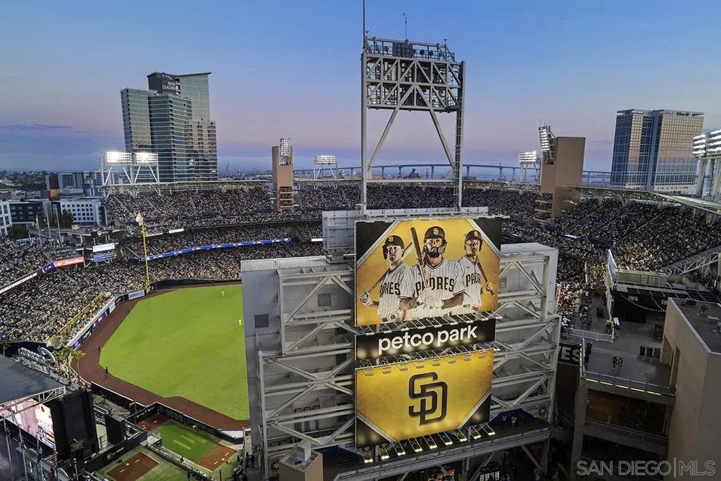 Batter up for views right into Petco Park! This beautifully remodeled southwest corner residence at The Legend features expansive windows and a private balcony, offering breathtaking views of the bay, city, and ballpark. And let's not forget those dazzling San Diego sunsets! Inside, the home shines with sleek engineered French Oak floors, elegant baseboards, and custom built-in cabinetry in the entryway and kitchen. Speaking of which, the open kitchen is a chef's dream, featuring premium stainless Thermador appliances, stylish quartz countertops and backsplash, recessed lighting, built-in storage, and a convenient eat-at bar with waterfall edge. The oversized primary bedroom is a true retreat, with expansive windows framing fantastic views, and a luxe ensuite bathroom with dual vanity, step-in shower, and gorgeous tile floors and surround. Additional highlights include a beautiful second bathroom, private storage, and two secured tandem parking spaces. Experience summer—and every day—like never before in this extraordinary Legend residence, where you will experience the dynamic energy of downtown from your front step.