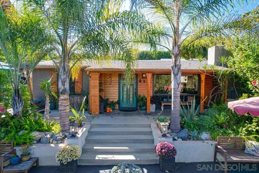 Welcome to your serene mid-century modern retreat in the heart of Fallbrook! This charming single-story home offers 3 bedrooms, 2 bathrooms, and 1,943 sq. ft. of living space, situated on a spacious 0.65-acre lot of flat, usable land, plus an additional 1 bed, 1 bath detached guest house/ADU—ideal for rental income or multi-generational living. Step inside to find a cozy living room with stunning wood ceilings and a classic brick fireplace. The kitchen is equipped with stainless steel appliances and granite countertops, while the additional family room boasts new porcelain floors, a gas fireplace, and easy access to the primary ensuite. The newly updated primary bathroom features a dual-sink vanity and an expansive shower. Step outdoors and discover a private paradise with endless features! Enjoy a hobby farm with secure animal pens, an orchard with assorted stone fruits, citrus, apple, mulberry, dragon fruit, and bananas, and lush landscaping with mature trees, tropical patios, custom palapas, and vibrant flowering plants. Relax by the Koi pond, unwind in the hot tub on the large deck, or entertain friends at the built-in BBQ and bar. Multiple patios with covers and sitting areas offer a perfect blend of sun and shade. With ample open space, this property offers excellent potential for a detached garage, workshop, second guest house/ADU, pool or even a horse corral. Additional features include a new roof on both the main house and guest house, a solar system and storage shed.