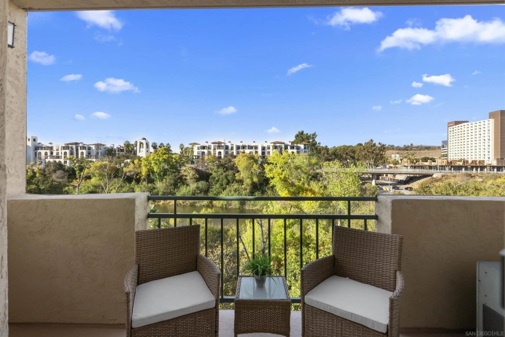 Step into your top floor dual primary 2br 2bath condo in River Colony. The building has a courtyard with tasteful landscaping and water feature. High ceilings with views of the San Diego River from every room. The entire condo and balcony has been freshly painted. Expansive floorplan with in unit full size washer and dryer in the hallway, Central AC and Heating, Balcony storage, large closets in both bedrooms and an open concept kitchen. This unit comes with two side by side parking spaces near the elevator. It's tucked away in the rear of the community and has easy access to a walking path along the SD River! It leads to the community center where you can enjoy a high speed wifi reading room, large pool and spa, plenty of seating and a large, modern fitness center. The HOA is extremely well kept.