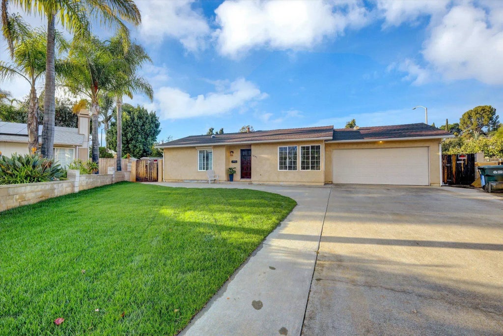 Stop the Car! This delightful home is nestled at the end of a cul-de-sac, just moments from El Norte Park. No HOA Rules here! Sitting on a spacious 7,000 sq ft lot, the interior has been painted in a neutral palette, with recessed lighting throughout. New light fixtures illuminate the dining room and bathrooms, while the new double interior entry doors lead into the third bedroom, which features a stunning brick fireplace. Additional features include new door hardware, exterior metal privacy shades in two of the bedrooms, and wooden blinds on most windows. The front yard has been refreshed with new sod, adding curb appeal to the home. Inside, the large, finished garage offers ample storage with multiple cabinets. The extra-large front driveway (45' long) easily accommodates multiple cars. Step into the fully fenced, private backyard, where you’ll find six fruit-bearing trees—avocado, fig, pomegranate, lemon, lime, and orange—ready to enjoy!