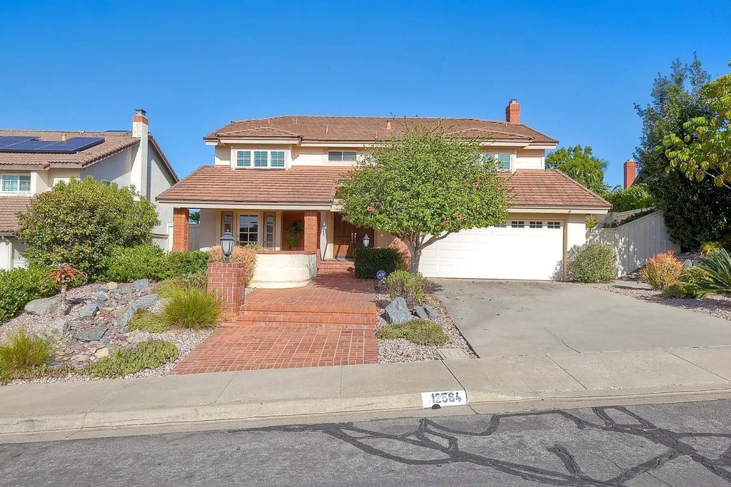 Expansive home in the Montelena community of Rancho Bernardo! Walking through the entry, you step down into the living room with its 2 story ceiling, dramatic windows on each side of the gas fireplace and sightlines through to the backyard pool. The dining room is open to the living room and has sliding glass doors to the backyard. The family room has a beautiful herringbone wood floor, gas brick fireplace, wet bar, lots of natural light and is open to the kitchen. The sizeable kitchen has a corner sink with 2 windows, tile counter