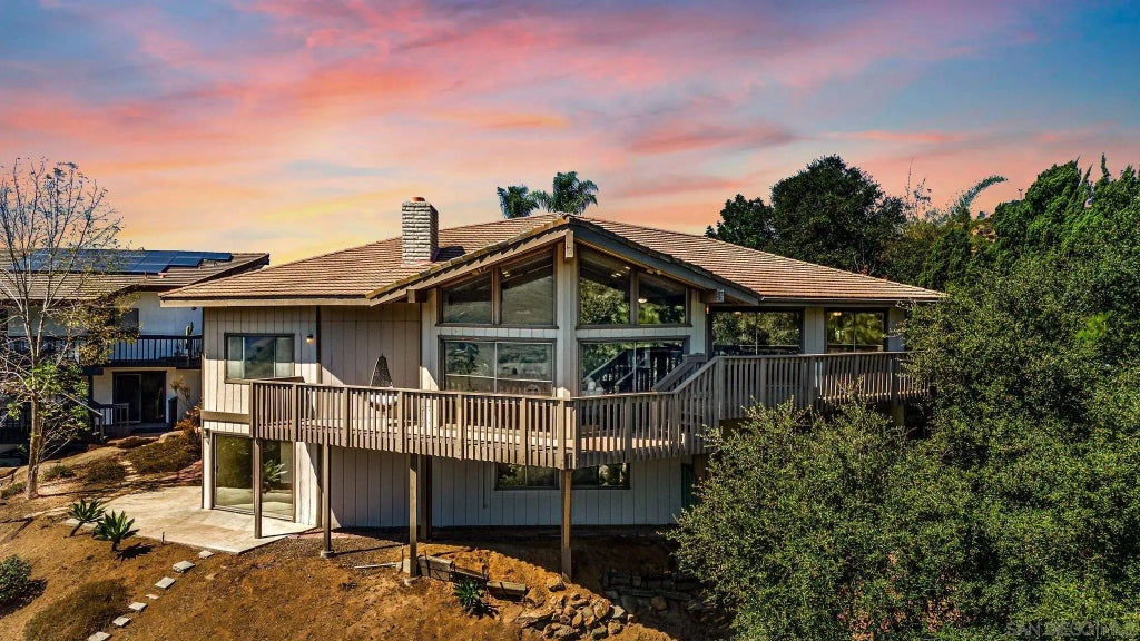 Discover this iconic mid-century modern home, featuring striking A-frame windows, nestled in the serene hills of Hidden Meadows with breathtaking views over Escondido, California, and a peek of the Pacific Ocean in the distance. Set on a quiet cul-de-sac, the welcoming entry through double doors leads you into the impressive foyer of this expansive 3,151-square-foot residence with potential to expand a large unfinished basement. Inside, you'll be captivated by the unique pitched roofline and floor-to-ceiling glass that frames stunning vistas of the rugged Escondido landscape. The thoughtful floor plan offers effortless living, highlighted by a spacious primary suite on the main floor, complete with an ultra-modern bathroom and a large walk-in closet. Enjoy the comfort of a newer HVAC system with a smart Nest thermostat. The updated kitchen boasts Carrera-style quartz countertops, elegant cabinetry, stainless steel appliances, and natural slate flooring. The elevated dining room seamlessly transitions to a wrap-around balcony that spans the entire back of the home, providing the perfect setting to savor magnificent sunsets and panoramic mountain views. Descend the wide staircase to discover generously sized bedrooms. Additional features include an oversized two-car garage with extra space for a golf cart or workshop/studio. The easy-care landscaping showcases drought-tolerant plants and an orange tree. A low HOA fee grants access to the Hidden Meadows pool, two lighted tennis courts, and an air-conditioned clubhouse. Conveniently located just minutes from I-15.